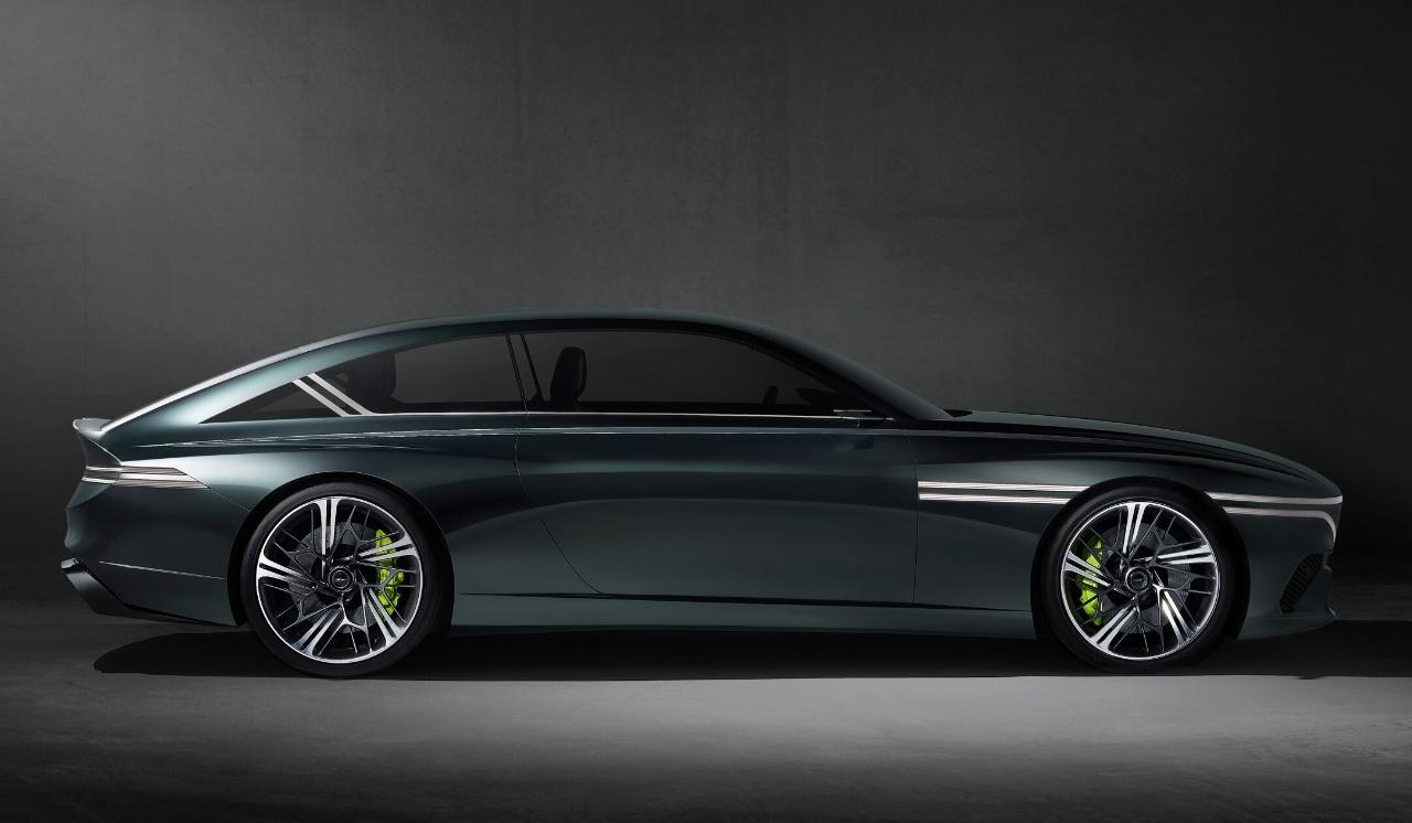 Die Fahrzeugfront zeigt die für Genesis charakteristischen „Zwei-Linien“-Leuchten als ein über die gesamte Breite verlaufendes Element. Es greift die Form des Crest-Frontgrills auf und integriert Tagfahrleuchten, Abblendlicht und Fernlicht zu einer Markensignatur für die Ära der Elektrifizierung. Das Gesicht soll den Wandel von Genesis zu einer reinen Elektroautomarke symbolisieren, die bis 2030 sechs EV-Modelle anbieten wird.