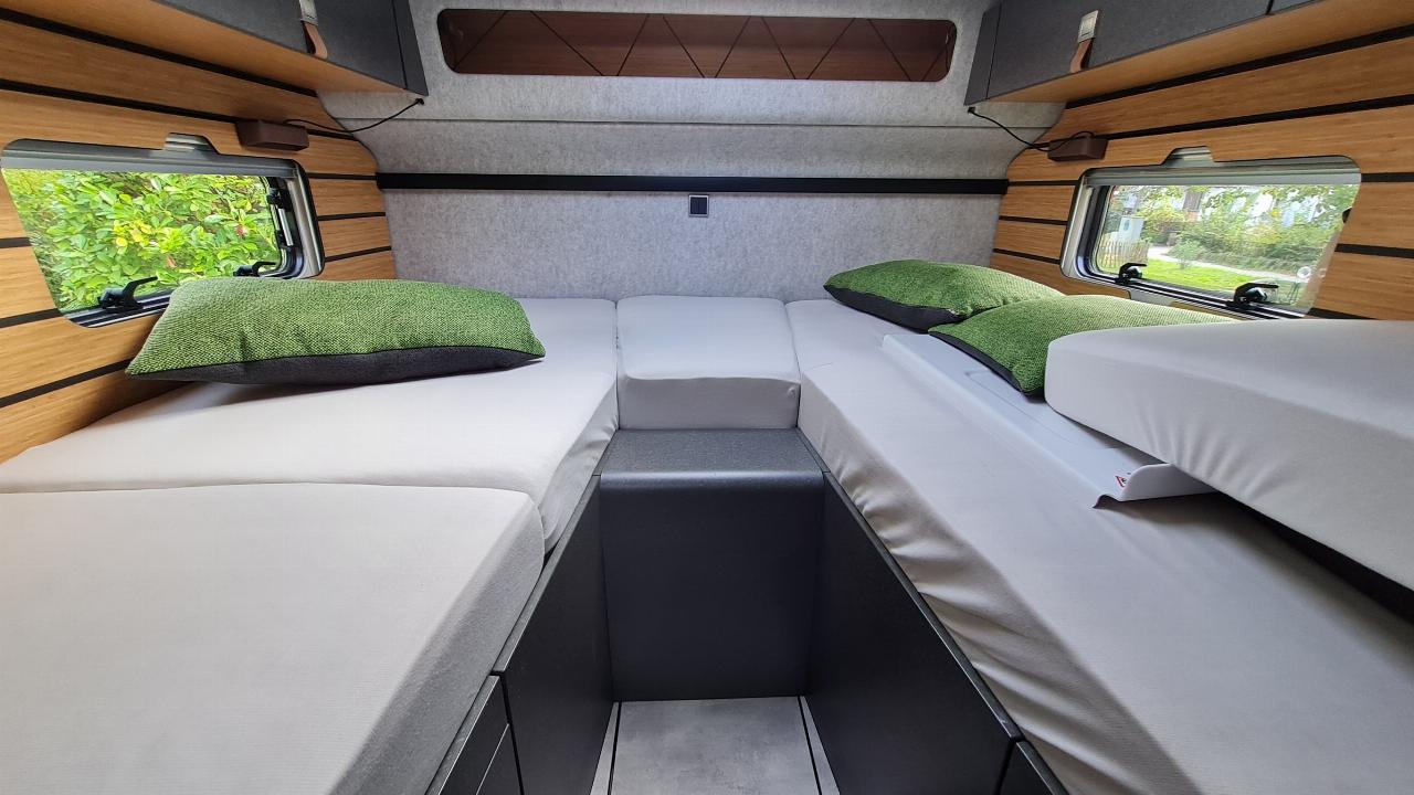 Die Einrichtung ist stilvollendet, viele natürliche Materialien wie etwa Bambus und Filz werden eingesetzt. Stauraum gibt es mehr als ausreichend, nicht zuletzt in der großen Heckgarage. Der ML-T 570 ist auf Autarkie getrimmt. Zwei Solarmodule auf dem Dach laden mit bis zu 190 Watt vier Lithium-Akkus, jeder von ihnen hat 80 Ah. Ein Wechselrichter mit 1800 Watt Leistung macht aus deren Energie 230 Volt Wechselstrom, der Betrieb von Haushaltsgeräten über die vier Bord-Steckdosen ist so möglich.