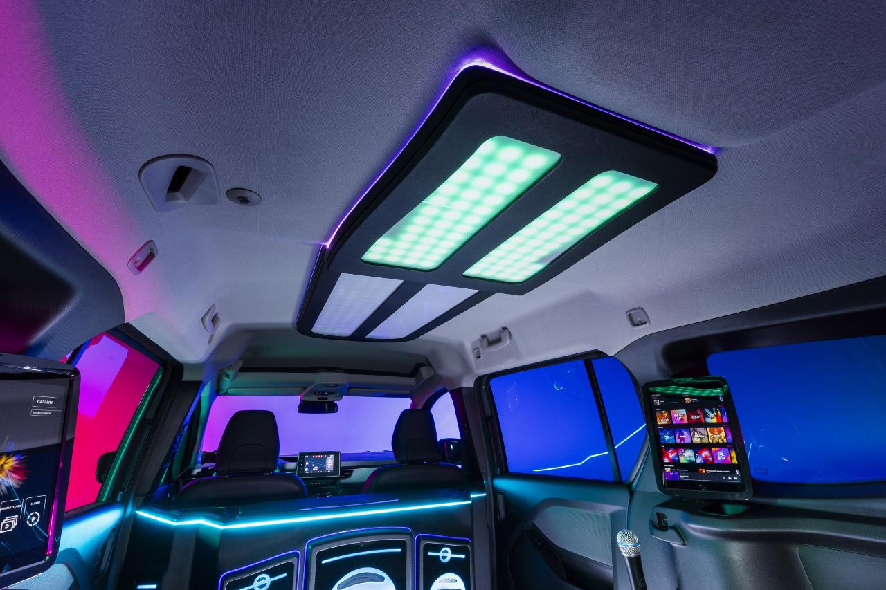 Basis für den Karaok-e ist der Townstar EV Kombi. Wo sonst die Rücksitzbänke sind, befindet sich eine Karaoke-Lounge mit viel Platz. Das Fahrzeug ist mit einem 32-Zoll-Bildschirm, über den die Songtexte verschiedenster Musikgenres laufen, und einem leistungsstarken Soundsystem ausgestattet. Die Beleuchtung ist mit dem Takt der Musik synchronisiert. Von außen macht das mobile Karaoke-Studio mit einer Flipflop-Lackierung auf sich aufmerksam, die die je nach Blickwinkel violett, blau oder grün erscheint. Mit geeigneten Apps können die Sängerinnen und Sänger ihre Auftritte mit Intros, Outros, Designs und Wasserzeichen personalisieren und über eine Go-Pro-Kamera aufzeichnen und über Social-Media-Kanäle teilen.