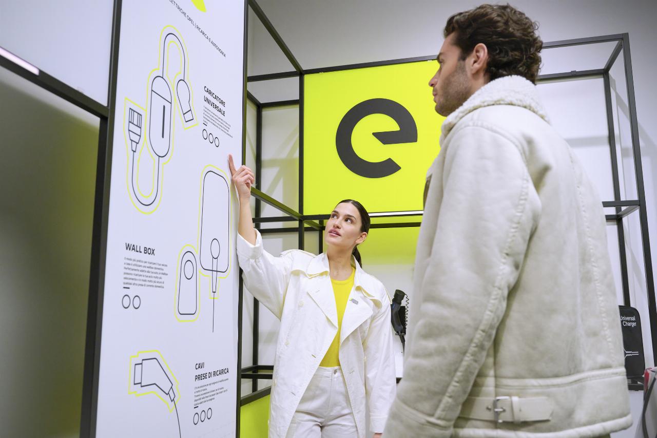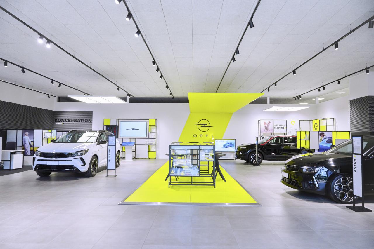 Opel stellt seine Autohäuser nach und nach auf die neue Corporate Identity um. Nach außen hin dominieren die Farben Gelb und Dunkelgrau mit dem neu gestalteten Markenlogo. Zentraler Punkt im Showroom ist eine in leuchtendem Opel-Gelb gestaltete Fläche. Der so genannte „Discovery Hub“ dient mit seinen besonders designten Stühlen und Sofas als Lounge-Bereich. Auch Merchandising-Artikel und praktisches Zubhör werden dort präsentiert. Vor den ansonsten in Weiß und Grau gehaltenen Flächen werden die ausgestellten Fahrzeuge unter fokussierenden Beleuchtungsbändern hervorgehoben. Ein spezieller Wandbereich widmet sich den Aspekten der Elektromobilität. Auch die Bereiche, in denen die persönlichen Beratungs- und Verkaufsgespräche geführt werden, werden neu gestaltet. (aum)