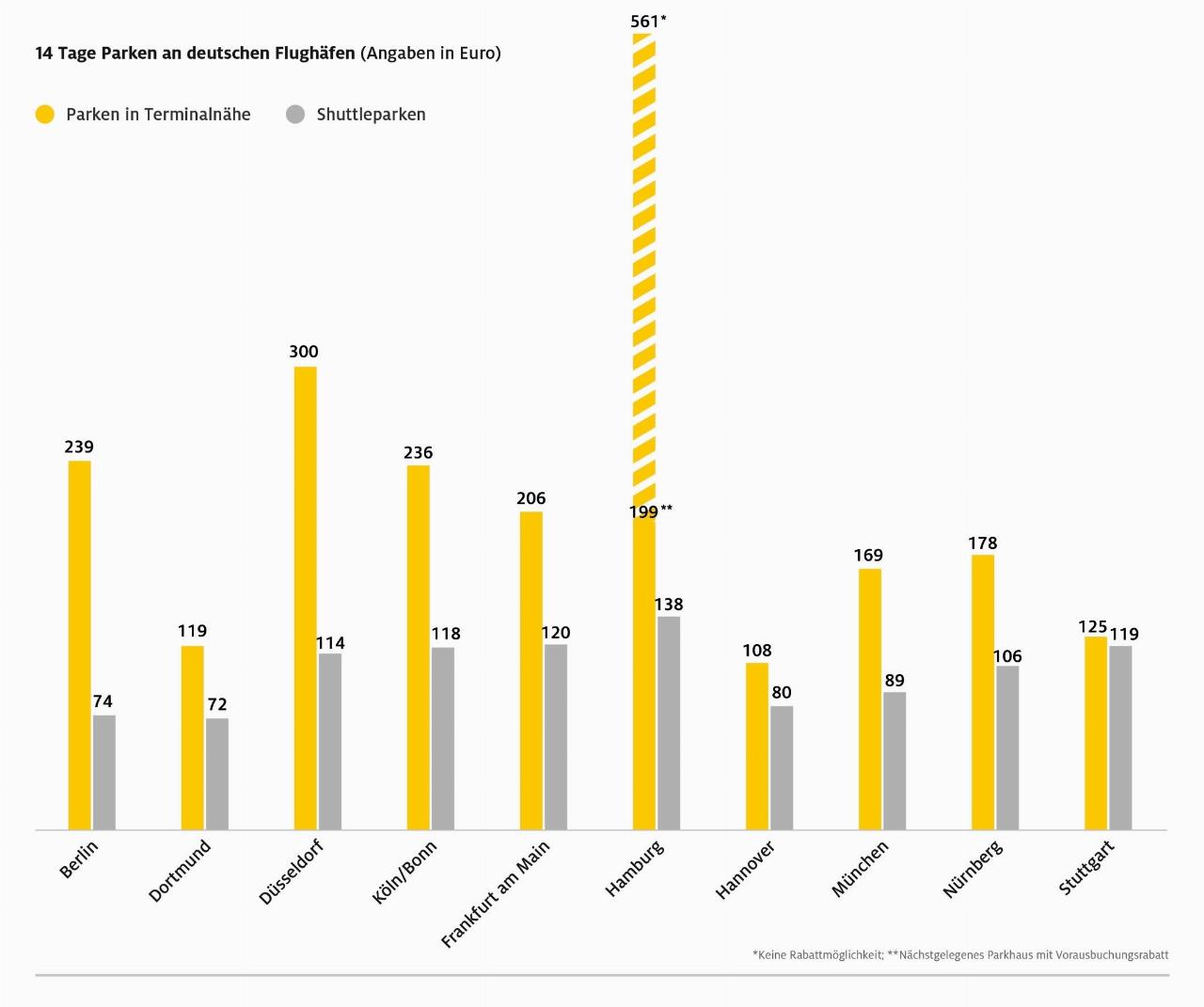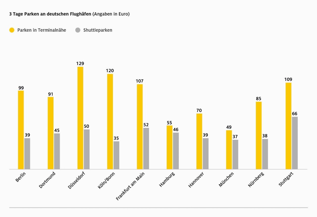 Bei Kurztrips liegen die Kosten für terminalnahes Parken zwischen 49 Euro in München und 129 Euro in Düsseldorf. Die günstigsten Stellplätze, das Shuttle-Parken, kosten zwischen 35 Euro in Köln/Bonn und 66 Euro in Stuttgart. Zwei Wochen Parken in der Ferienzeit schlagen direkt am Terminal mit 108 Euro (Hannover) bis 561 Euro (Hamburg) zu Buche. Der teure Tarif in der Hansestadt liegt daran, dass es dort für das Parkhaus am Terminal keinen Frühbucher-Rabatt gibt. Allerdings kann man direkt nebenan auch 14 Tage für 199 Euro parken. Shuttle-Parken kostet für diesen Zeitraum zwischen 72 Euro (Dortmund) und 138 Euro (Hamburg).