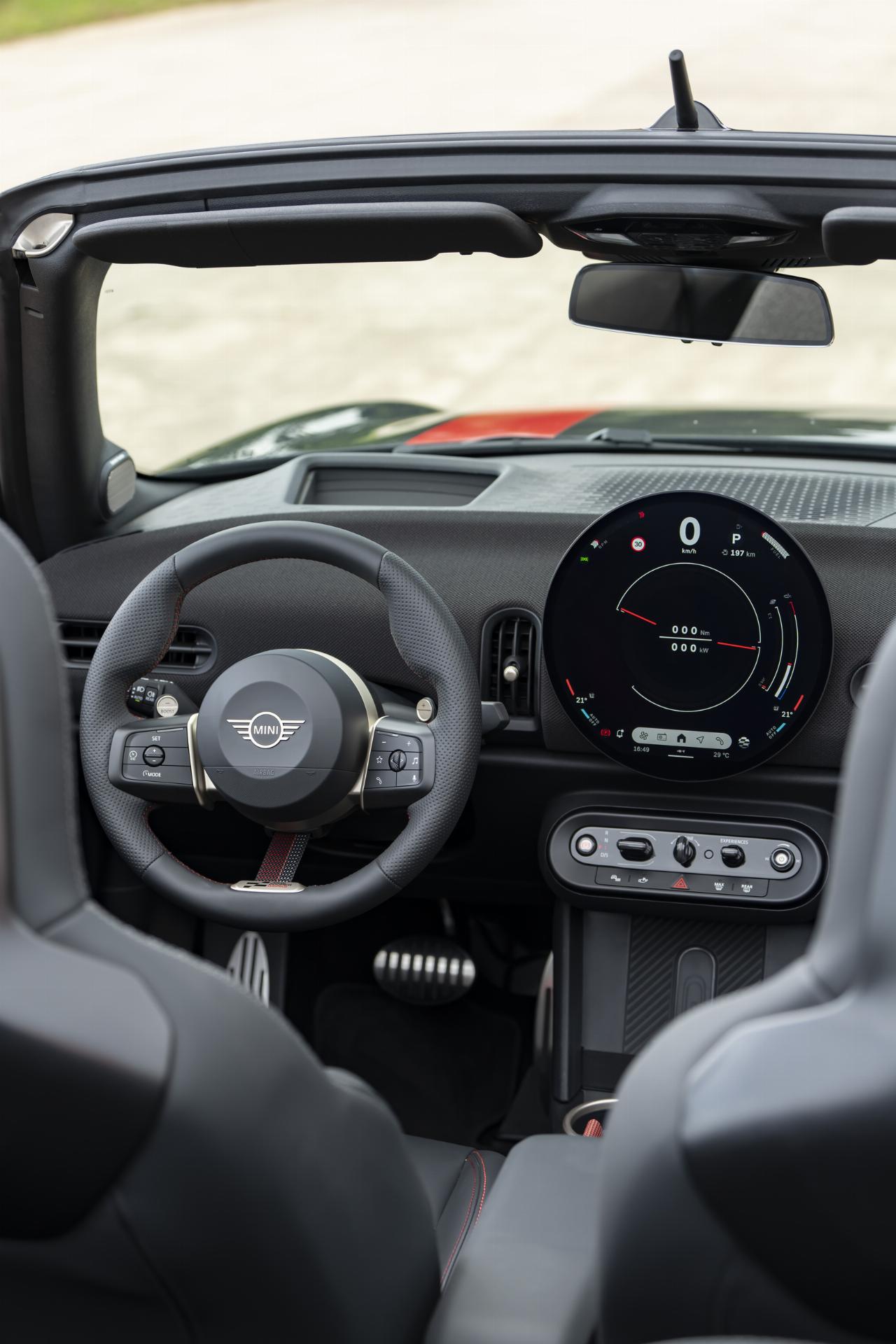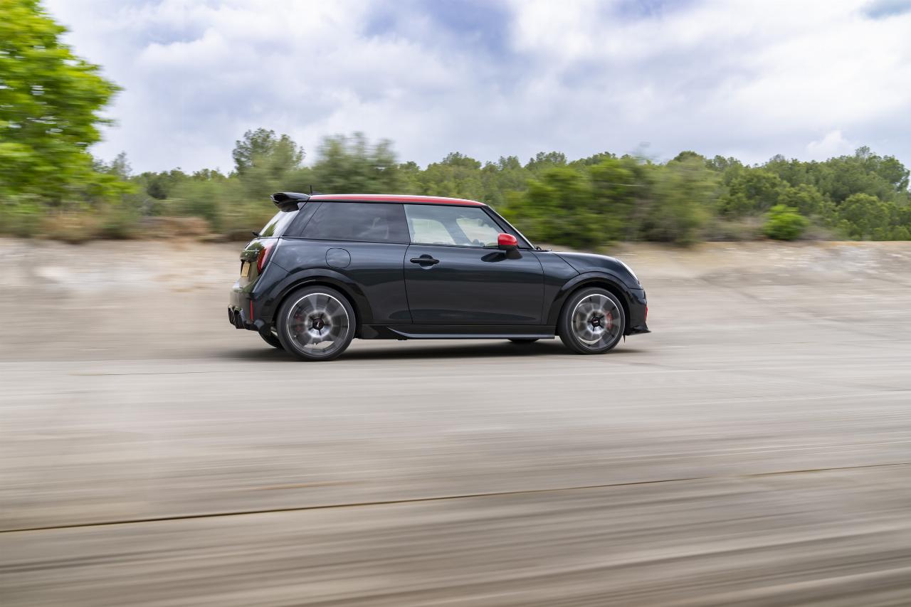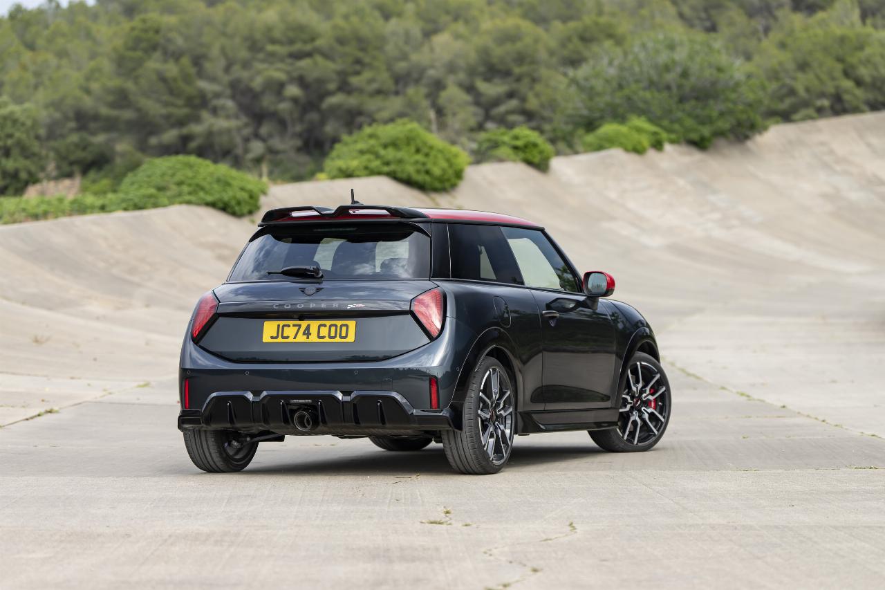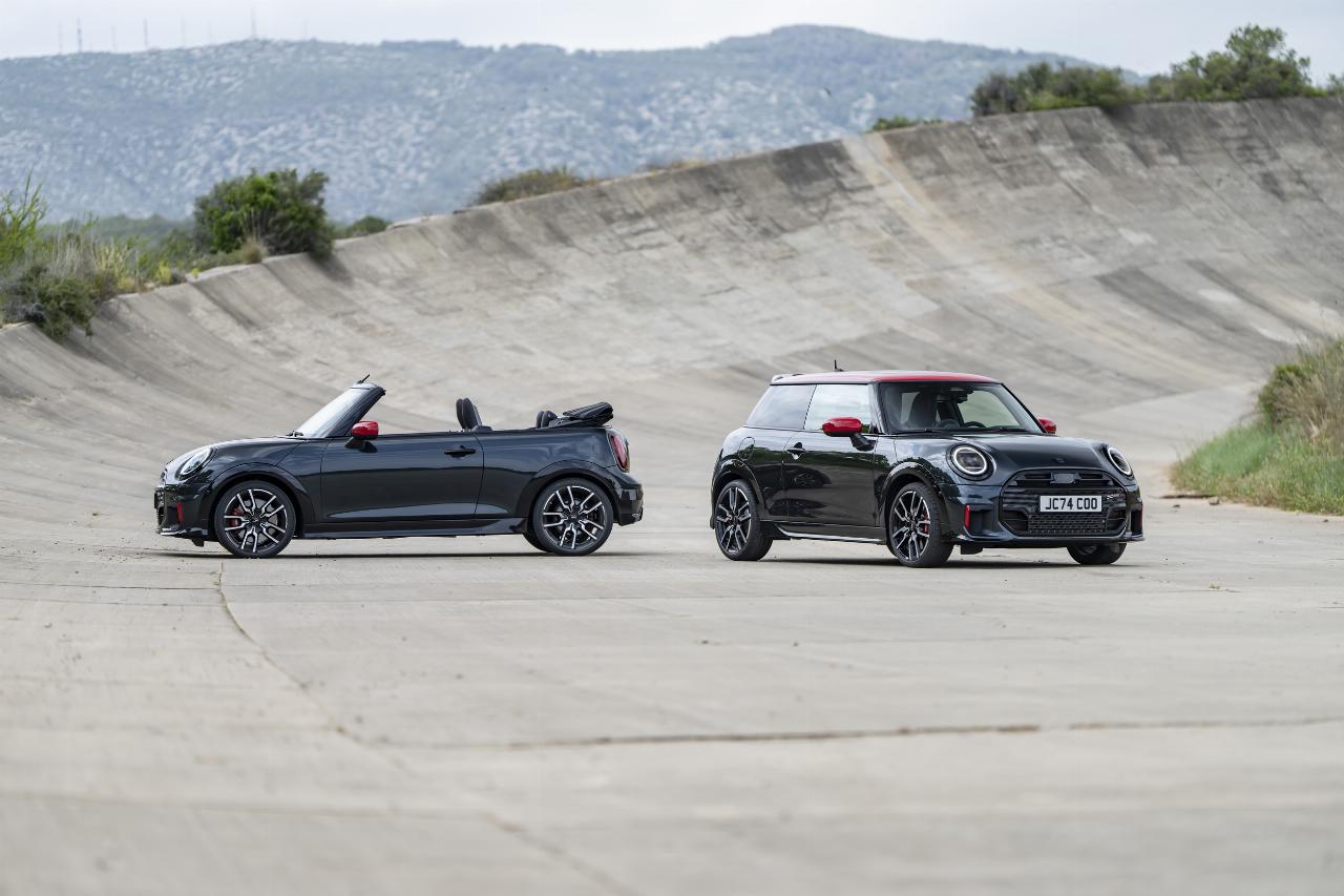 Die spezifische Frontschürze trägt sowohl zu höherer Luftzufuhr für die Motorkühlung als auch zu besserer Aerodynamik bei. Bestimmende Karosserie- und Interieurfarben sind Schwarz und Rot. Der JCW erreicht eine Spitzengeschwindigkeit von 250 km/h, das Cabrio kommt auf 245 km/h. Der Mini John Cooper Works kann wahlweise mit einem Kontrastdach und Spiegelkappen in den Farbtönen Chili Red und Jetblack akzentuiert werden. Das Cabrioverdeck ist in Schwarz oder mit einem in Grau abgesetzten Union-Jack-Muster verfügbar.