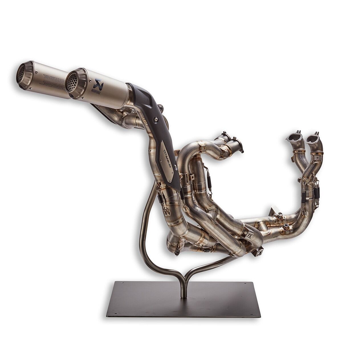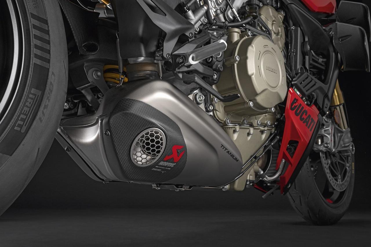 Wer die Leistung der Streetfighter V4 auch auf der Rennstrecke nutzen möchte, kann die in Zusammenarbeit mit der Rennsportabteilung Ducati Corse entwickelte Akrapovic-Titanauspuffanlage verwenden, die 5,5 Kilogramm leichter ist, der Leistungs- und Drehmomentzuwachs im mittleren Drehzahlbereich liegt bei sechs Prozent. Der Auspuff wird zusammen mit einem aus dem Rennsport stammenden Polyester-Luftfilter und einem speziellen Mapping geliefert, mit dem alle Parameter der Assistenzsysteme an die erhöhte Leistung des Motorrads angepasst werden. Der Auspuff wird mit einem spezifischen Carbonschutz kombiniert.