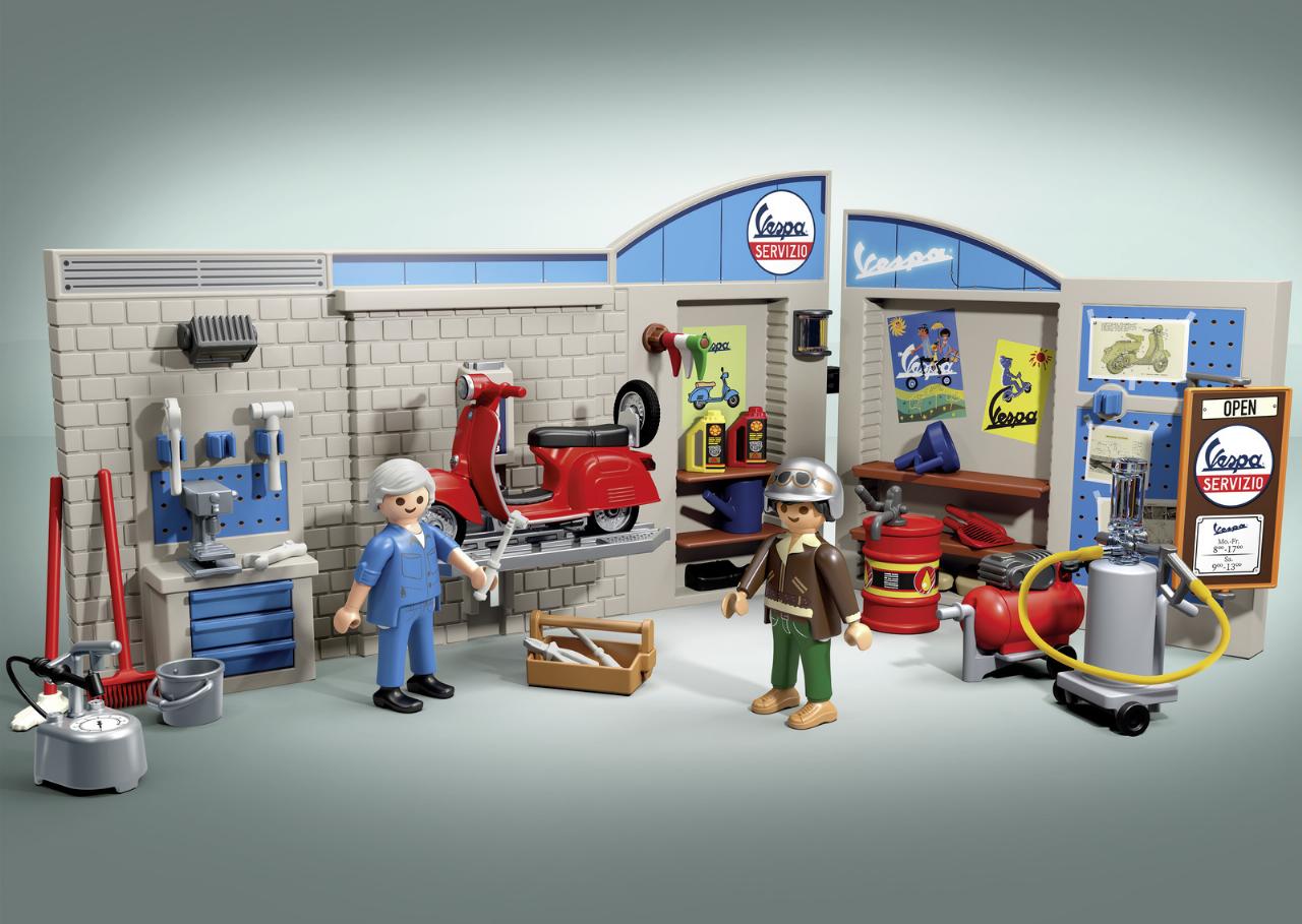 Damit nicht genug: Als Extraset bietet Playmobil noch eine Rollerwerkstatt an. Die Packung enthält neben einer roten Vespa und zwei Figuren unter anderem eine Hebebühne, eine Werkbank und eine Zapfsäule.