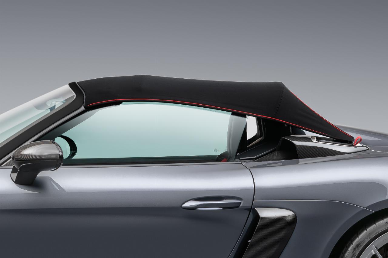 Der 718 Spyder RS ist mit 1410 Kilogramm 40 Kilogram leichter als der 718 Spyder und sogar fünf Kilogramm leichter als die geschlossene Version GT4 RS. Zahlreiche Leichtbauteile wie Sitzschalen und Fronthaube in CFK tragen zur Gewichtsersparnis bei. Details wie einfache Schlaufen zum Offenen der Türen oder eben das einlagige Verdeck tun ein Übriges. Es wiegt nur 18,3 Kilogramm, 16,5 Kilogramm weniger als das des 718 Boxster. Wer sich des Wetters sicher ist, lässt es einfach in der heimischen Garage und spart so weitere Kilos.