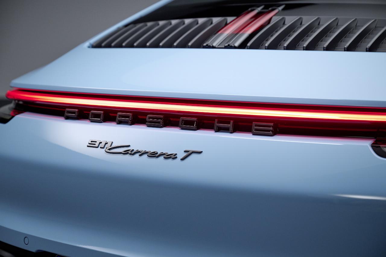 Beim Exterieur hebt sich der T durch dunkelgraue Akzente vom Rest der Baureihe ab. Kontrastelemente wie die Ober- und Unterschalen der Außenspiegel, die neuen Türschriftzüge sowie die Heckschriftzüge und die Zierleisten auf dem Heckdeckelgitter sind in Achatgrau gehalten. Außerdem trägt die Windschutzscheibe einen Graukeil. Die Endrohre der Sportabgasanlage sind in Hochglanzschwarz ausgeführt. Dadurch wirkt der 911 Carrera T noch extrovertierter und dynamischer.