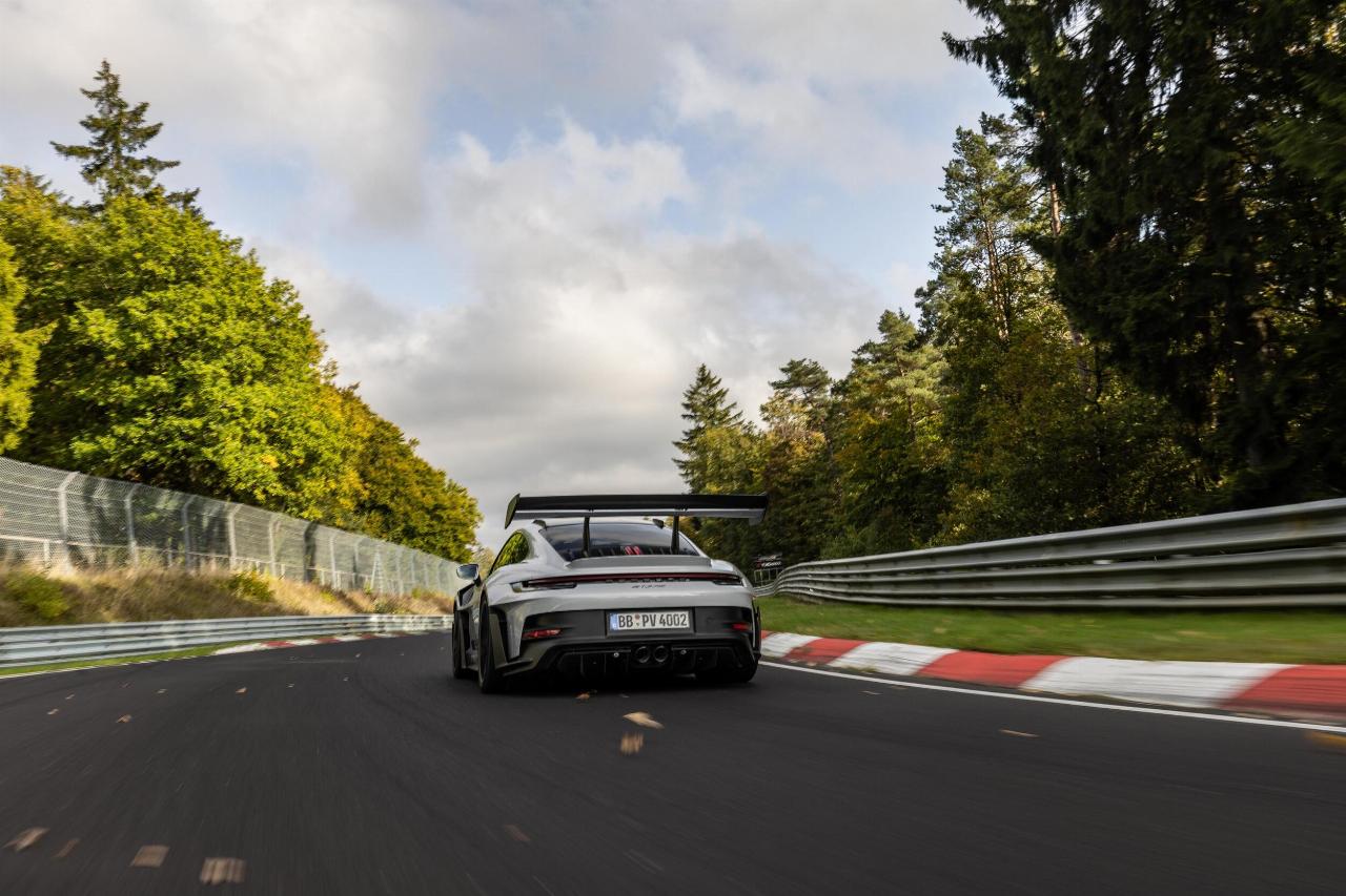 Der 525 PS (386 kW) starke 911 GT3 RS mit Weissach-Paket war mit den optional erhältlichen Reifen Michelin Pilot Sport Cup2 R in den Dimensionen 275/35 R 20 vorn und 335/30 R21 hinten ausgerüstet. Bei 285 km/h erzielt der RS einen Gesamtabtrieb von 860 Kilogramm – dreimal so viel wie ein 911 GT3. Die früher gebräuchliche verkürzte Runde absolvierte er in 6:44,848 Minuten. (aum)