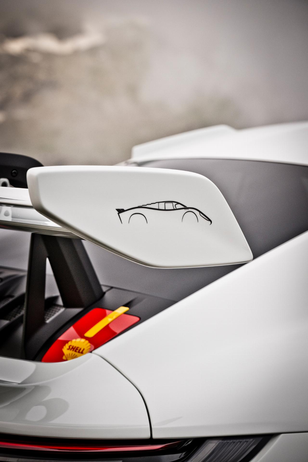 Das Fahrzeug ist vorwiegend in Purweiß lackiert und trägt wie sein Vorbild an den vorderen Kotflügeln und Teilen der Bugpartie vipergrüne Kontrastflächen. Beide Töne stammen aus dem „Farbe nach Wahl“-Programm. Auch das Mittelteil des großen Heckflügels ist in dem Grün lackiert. Die Startnummer entspricht jener historischen des legendären 1000-Kilometer-Eröffnungsrennens. Die „29“ befindet sich auf den Türen, der Fronthaube, unter dem Heckflügel sowie auf den Ventilkappen der Reifen. Der klassische Porsche-Schriftzug mit Streifen-Design auf den Türen und Seitenteilen ist ebenfalls vom damaligen Rennwagen inspiriert.