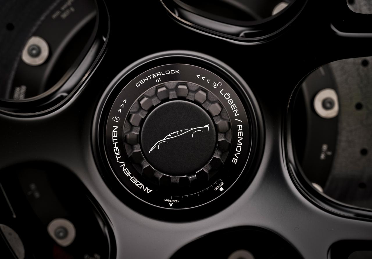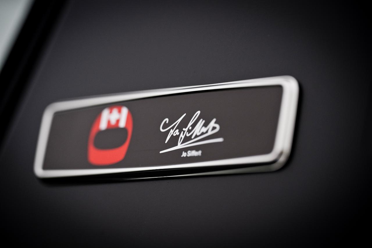Auf dem Zentralverschluss der satinschwarzen Magnesiumräder ist die Silhouette des 917 KH zu sehen, die stilisierte Seitenansicht ziert ebenso die Sideplates des Heckflügels. Auf den B-Säulen sitzt eine spezielle Plakette im Helm-Design: Als persönlicher Bezug sind dort der Name und die Unterschrift von Jo Siffert abgebildet.