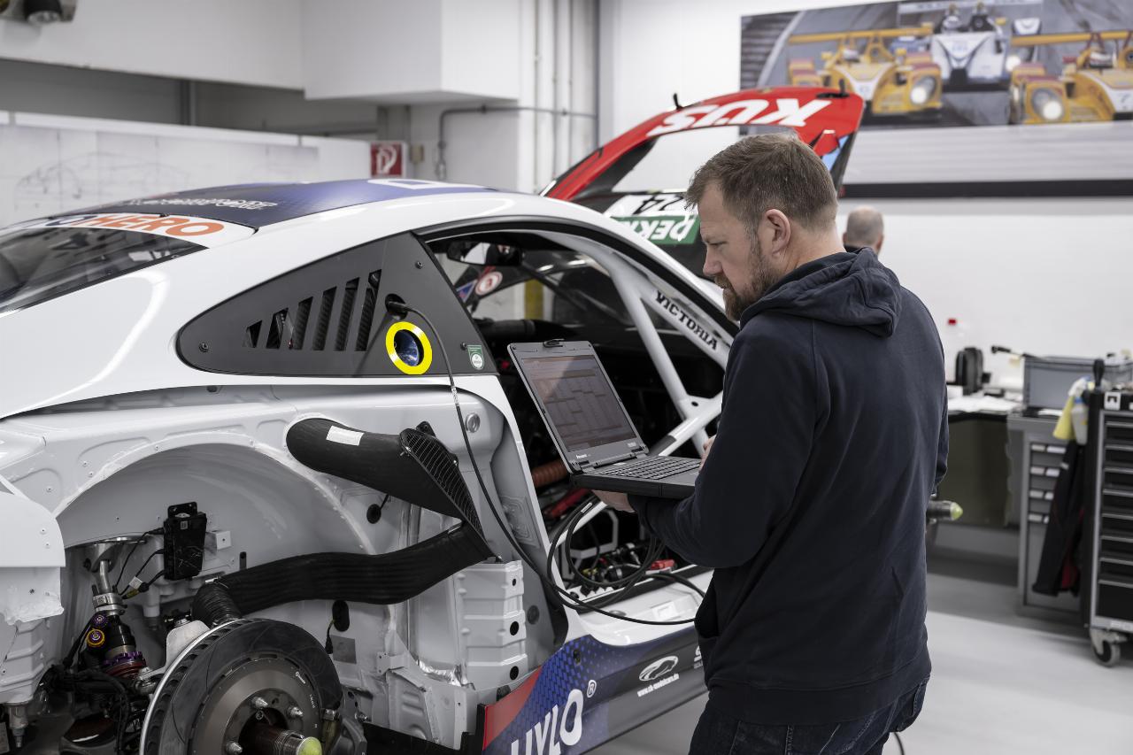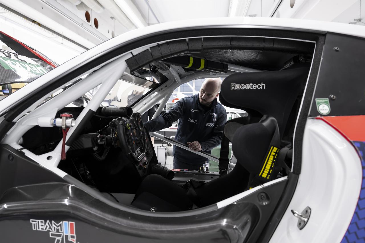 Mit den Innenräumen der beiden nebeneinander stehenden Rohkarossen startete das Instandsetzungsprojekt. Kabelstrang, Steuergeräte, Feuerlöschanlage und Pedalerie wurden eins zu eins vom verunfallten Fahrzeug in das neue Chassis eingebaut, ebenso das Armaturenbrett. Als nächstes folgen Klimaanlage, Fahrwerks- und Karosserieteile sowie die Verrohrung. Ganz zum Schluss montieren die Spezialisten Motor und Getriebe des Rennautos.