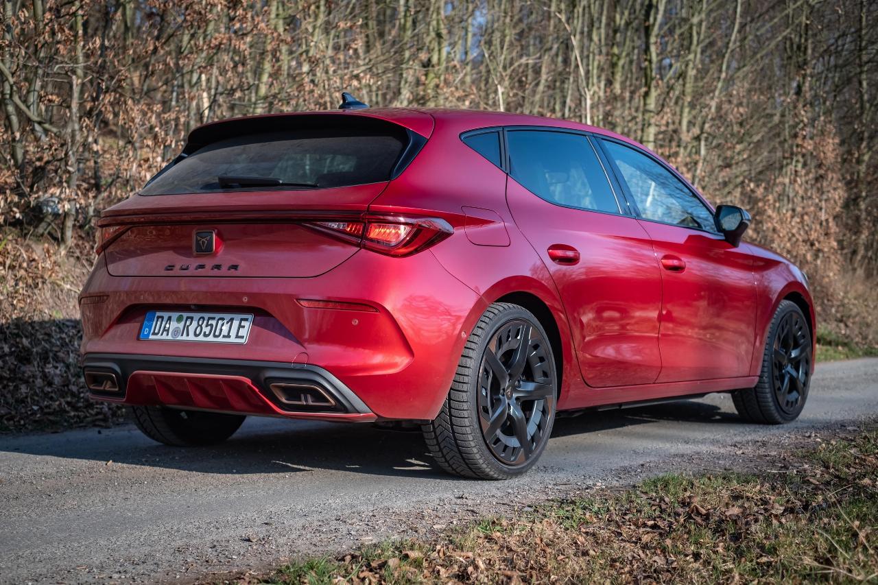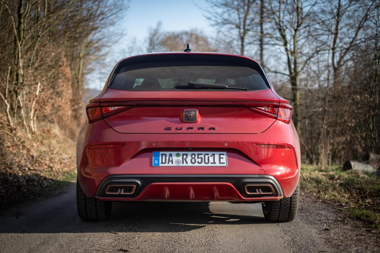Mit Vorsicht hat sich Cupra an den Leon herangetraut. Anders als das Eigengewächs Formentor sind weniger dynamische Formen erkennbar, auch an Seitenschwellern, Lippe und Heckspoiler im Großformat wurde gespart. So weit hätte man sich von der nächsten Nenngröße auf Basis des Leon nicht distanzieren müssen, denn die bronzenen Kontraste rund um die Karosserie sowie die futuristischen Designfelgen mit bronzener Teillackierung entlocken dem Betrachter in der Regel sowieso einen zweiten Blick. Auch mit den beidseitig angedeuteten Auspuffblenden in Bronze haben sich die Schöpfer aus Martorell keinen Gefallen getan – denn wo nichts ist, muss man auch nichts hervorheben.