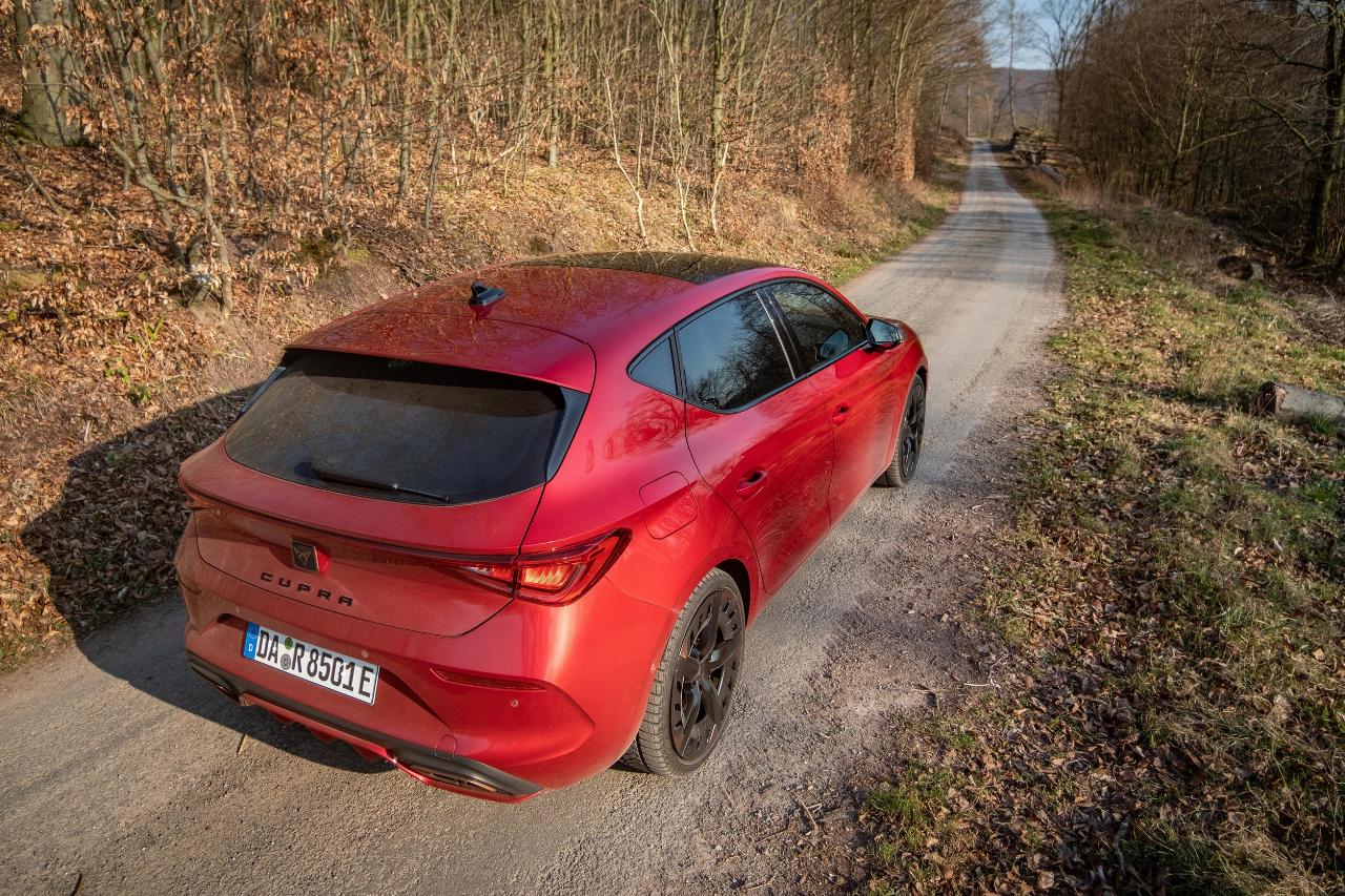 Bei den Fahrleistungen ist der Plug-in-Hybrid gut aufgestellt: In 6,7 Sekunden spurtet der 1671 Kilogramm schwere Cupra Leon auf Tempo 100 km/h. Als Höchstgeschwindigkeit sind 225 km/h angegeben. In der Klasse der Hot Hatches geht das in Ordnung, ist jedoch keine rechte Überraschung. Spaß macht der Leon besonders auf bergigen Straßen, wenn es im Cupra-Modus die volle Ladung Elektronen aus einem geladenen Akku hagelt. Dann schiebt sich der beleibte Kompaktwagen schier federleicht bis zum Gipfel und darf anschließend beim Herunterfahren wieder etwas rekuperieren. Die Fahrleistungen entsprechen etwa denen eines VW Golf GTI mit fast 200 Kilogramm Zusatzgewicht – womit der Cupra Leon 1.4 e-Hybrid hinsichtlich der Tauglichkeit für Trackdays oder Ähnliches eher limitiert ist.