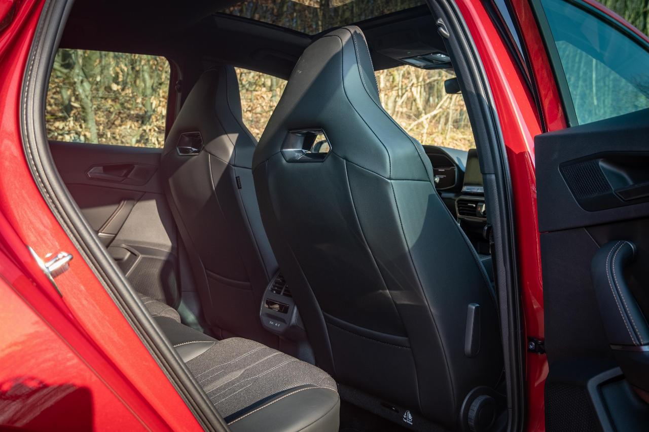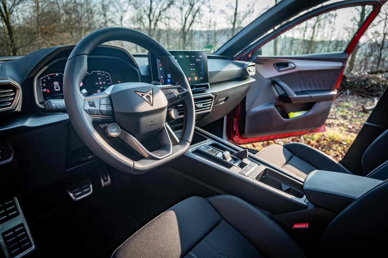 Für solche modernen Besonderheiten entschädigen traditionelle Werte auf der anderen Seite: Die Verarbeitung macht einen guten Eindruck, und die Sportsitze überzeugen auf ganzer Linie. Bequem genug für eine Fahrt von Hamburg nach Frankfurt, aber trotzdem fest im Sattel: So geht ein Sportsitz in der Kompaktklasse. Auch bei der Verarbeitung leistet Cupra ganze Arbeit und kann mit robustem abgestepptem Stoff und sauber verarbeiteten Ziernähten punkten. Das Leder der geteilten Materialkombination macht einen hochwertigen Eindruck.