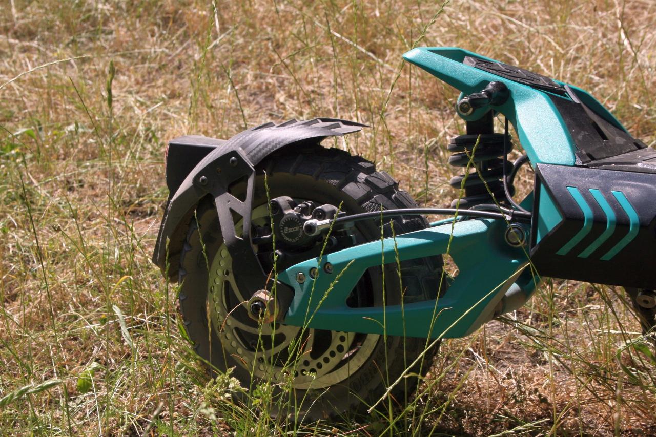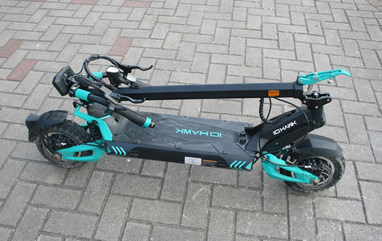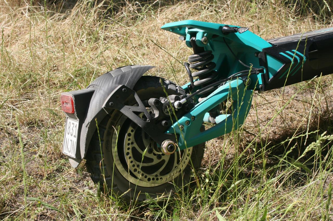 Wegen seiner Auslegung als „Offroader“ bringt der IO Hawk zwei Federbeine und eine Vorderradschwinge mit. Die Technik hat gleich in doppelter Hinsicht ihren Preis: Der Legacy kostet offiziell 2099 Euro (derzeit rabattiert 300 Euro weniger) und wiegt stolze 34 Kilogramm. Das ist weit mehr als ein Pedelec, spricht aber für die Robustheit der Konstruktion. Und die kann überzeugen, hat allerdings auch einen Nachteil: Wenn der elektrische Kickscooter wegen leerer Batterie tatsächlich einmal als reiner Tretroller benutzt werden muss, ist das Vorwärtskommen etwas beschwerlicher. Doch mit einer angegebenen Reichweite von bis zu 120 Kilometern ist die Gefahr des Liegenbleibens relativ gering.