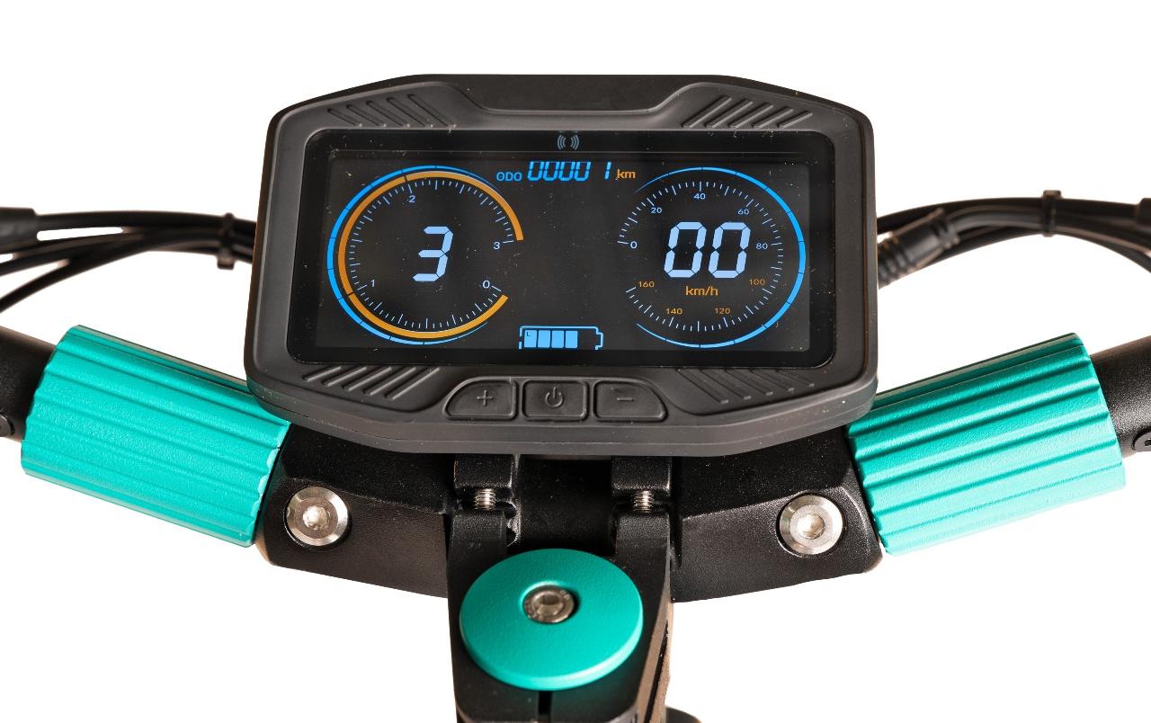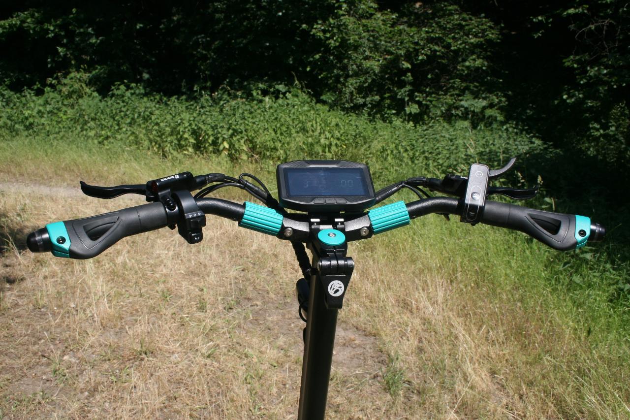 Statt eines Drückers für den Daumen verfügt der Legacy über einen mit dem Finger zu ziehenden Beschleunigungshebel. Das macht vor allem auf unbefestigten Wegen Sinn, da der Fahrer den E-Scooter so auf holperigen Strecken besser im Griff hat und im Gelände nicht so leicht abrutscht wie mit dem Daumen. Der Offroader unter den E-Rollern bietet drei Fahrstufen, die die Geschwindigkeit auf zehn, 15 und 20 km/h (Display: 23 km/h) begrenzen. Das da noch viel mehr ginge, legt der lange tote Weg nahe, den der „Gasgriff“ noch bis zum Anschlag zurücklegen kann.