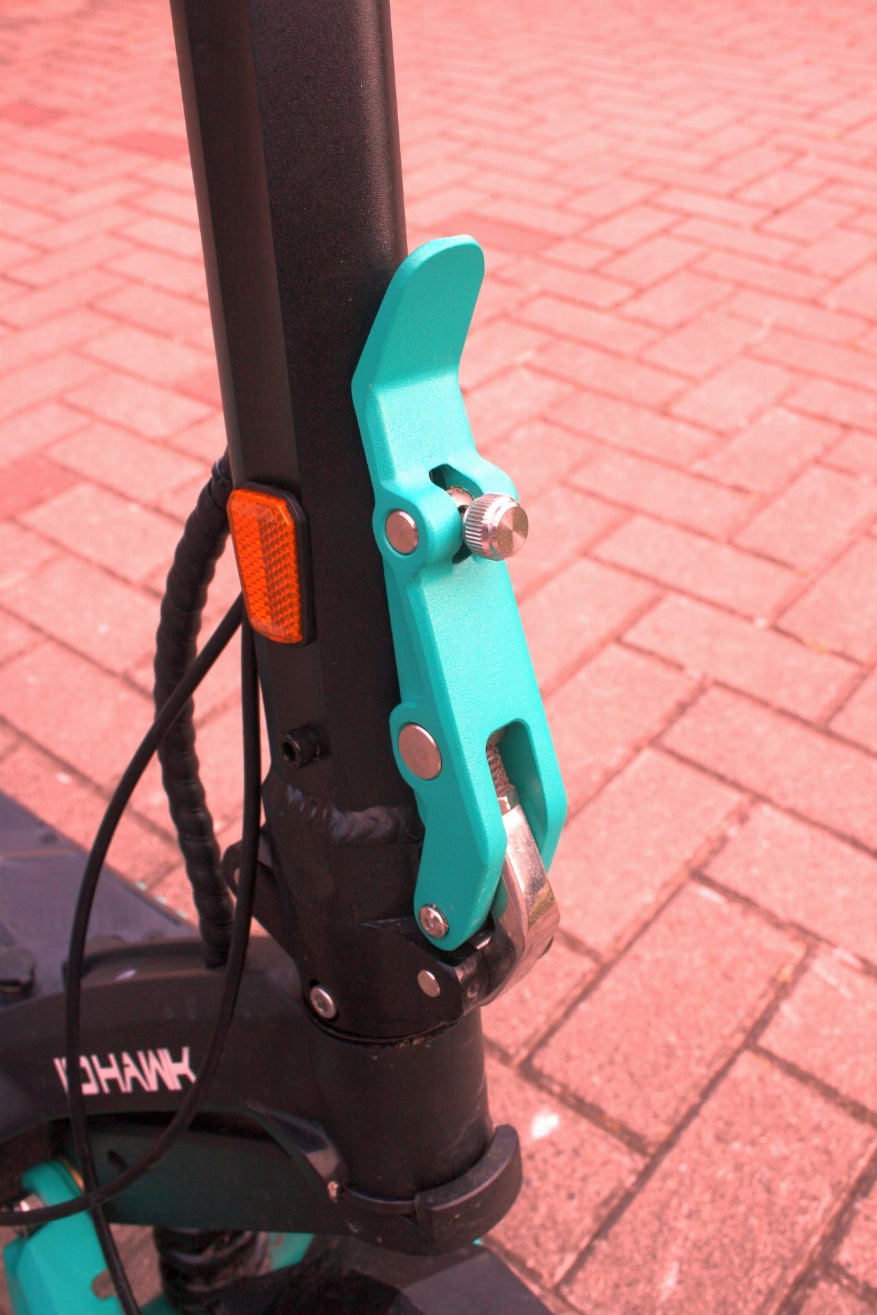 Etwas umständlich, aber dafür gut gesichert ist der Klappmechanismus, wenn der Scooter verstaut oder getragen werden soll. Der Spanner ist zusätzlich mit einer Schraube an der Lenkstange gesichert, die erst losgedreht werden muss. Vor allem beim Wiederzusammenbau wird es etwas fummelig, da es nicht immer auf Anhieb gelingt, die Gewindebohrung zu treffen. Nicht ganz überzeugen kann die anschließende Arretierung der liegenden Lenkstange zur Verwendung als Tragegriff. Hier dient der Taschenhaken als Klammer, bietet aber zu viel Spiel. Wird der Scooter angehoben, steht er unter Spannung, wird er aber wieder losgelassen, kann sich der Haken lösen und greift beim nächsten Anheben nicht mehr automatisch.