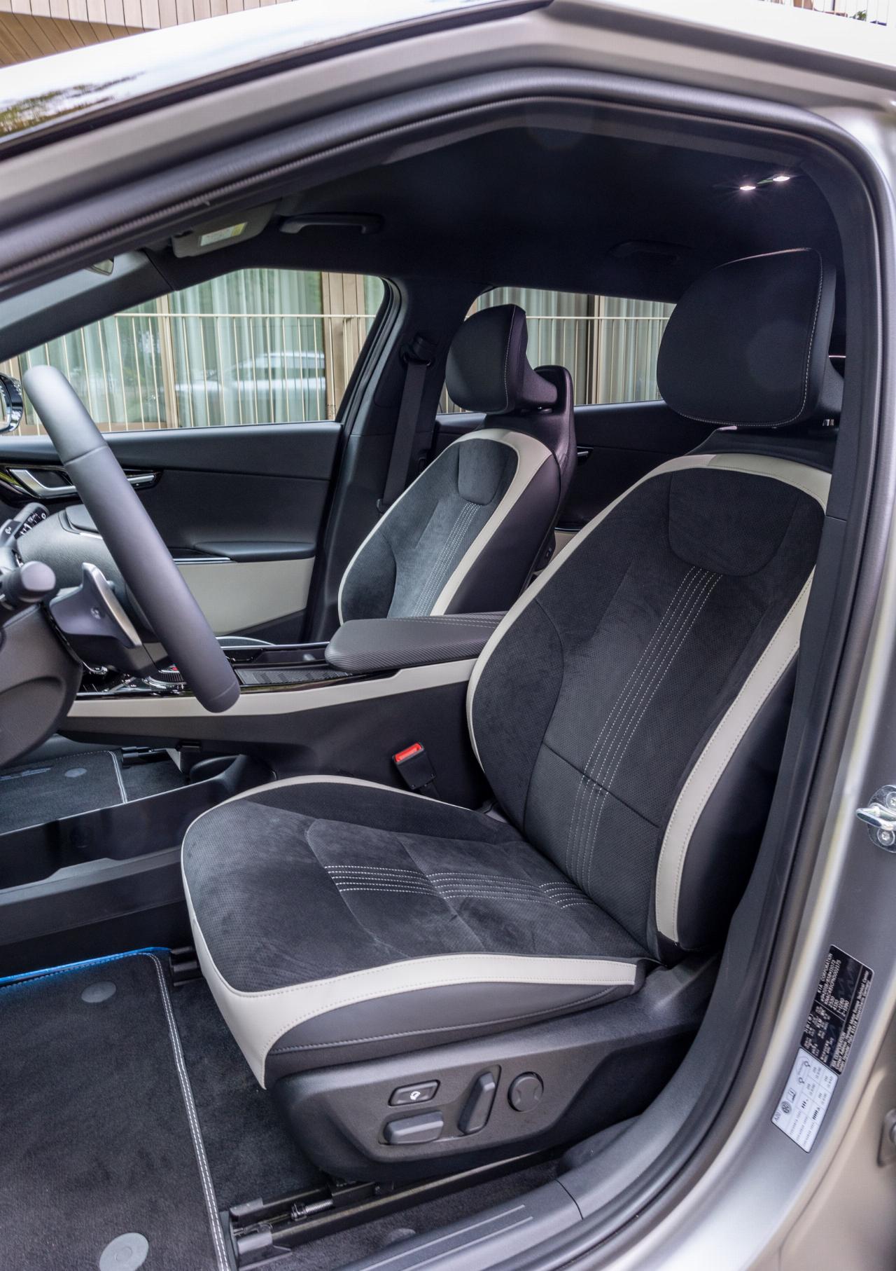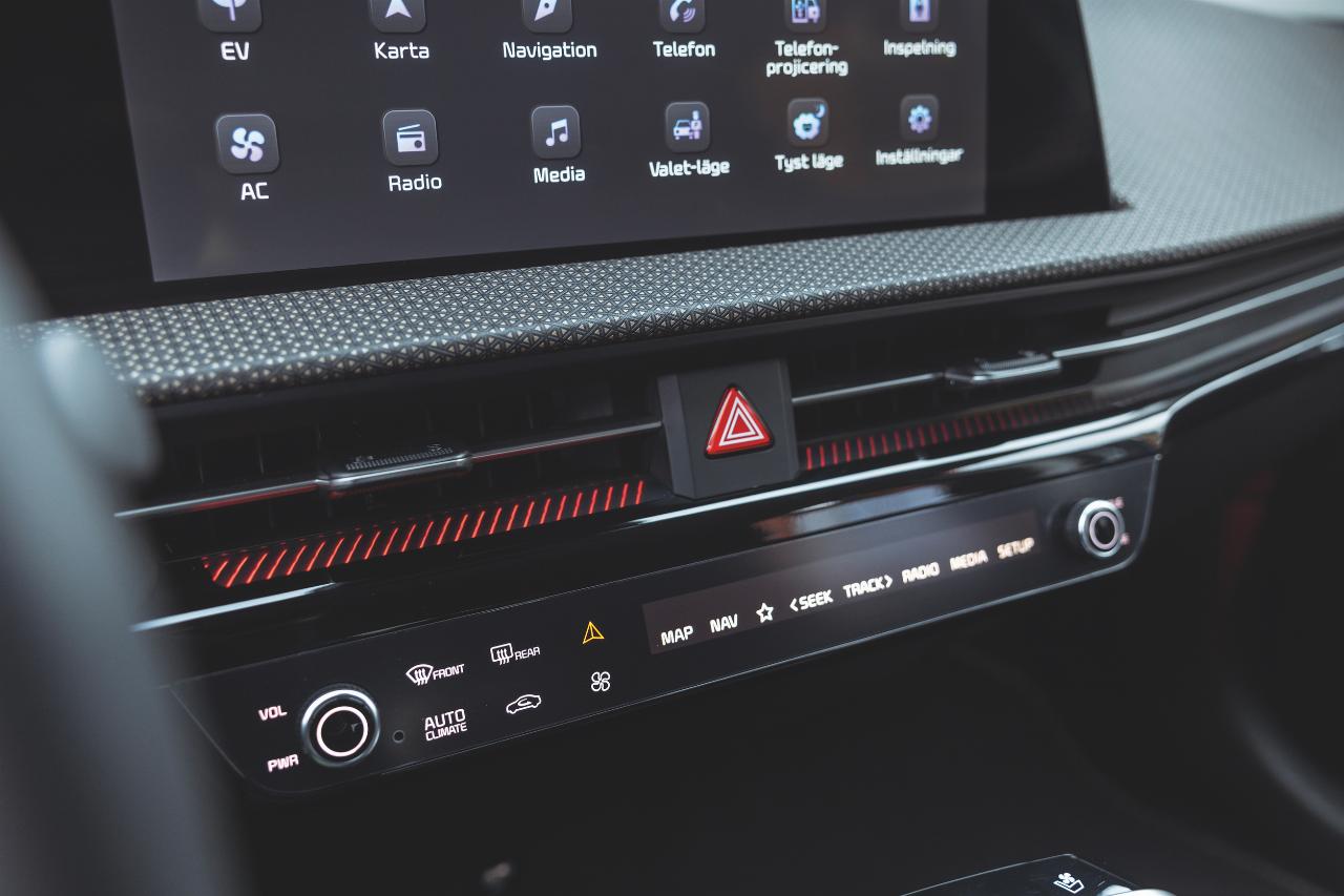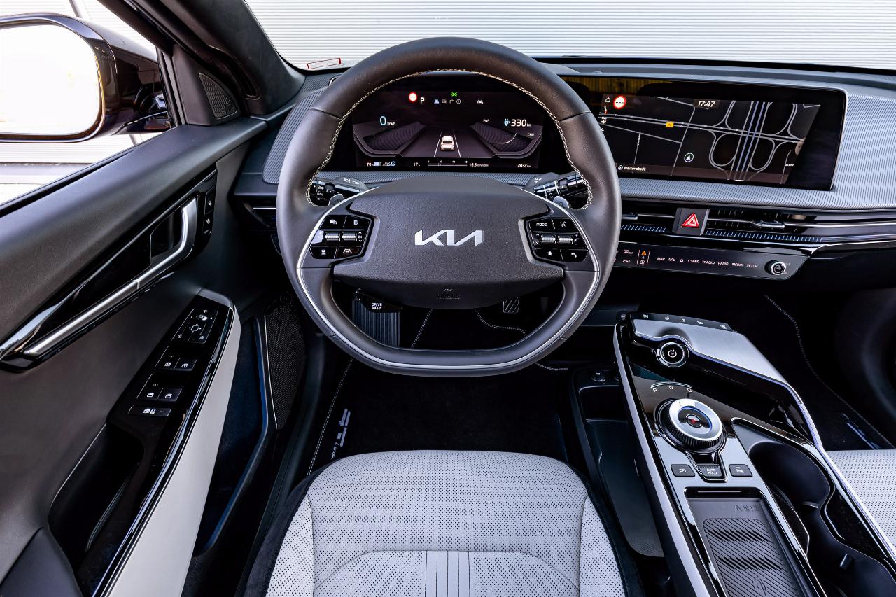 In seinem Innern präsentiert sich der Kia nachhaltig. Die bequemen Sitze sind mit tierfreiem Leder bespannt und das Cockpit trägt Dekorelemente aus recycelten PET-Flaschen. Das schont nicht nur die Ressourcen, sondern sieht zudem recht schick aus. Der Fahrer blickt auf zwei hochauflösende 12,3 Zoll-Bildschirme, die zu einer optischen Einheit zusammengefasst sind. Während der linke Monitor alle wichtigen Informationen wie Geschwindigkeit und Restreichweite darstellt, dient der rechte für das Multimediasystem.