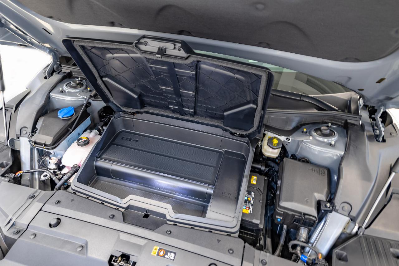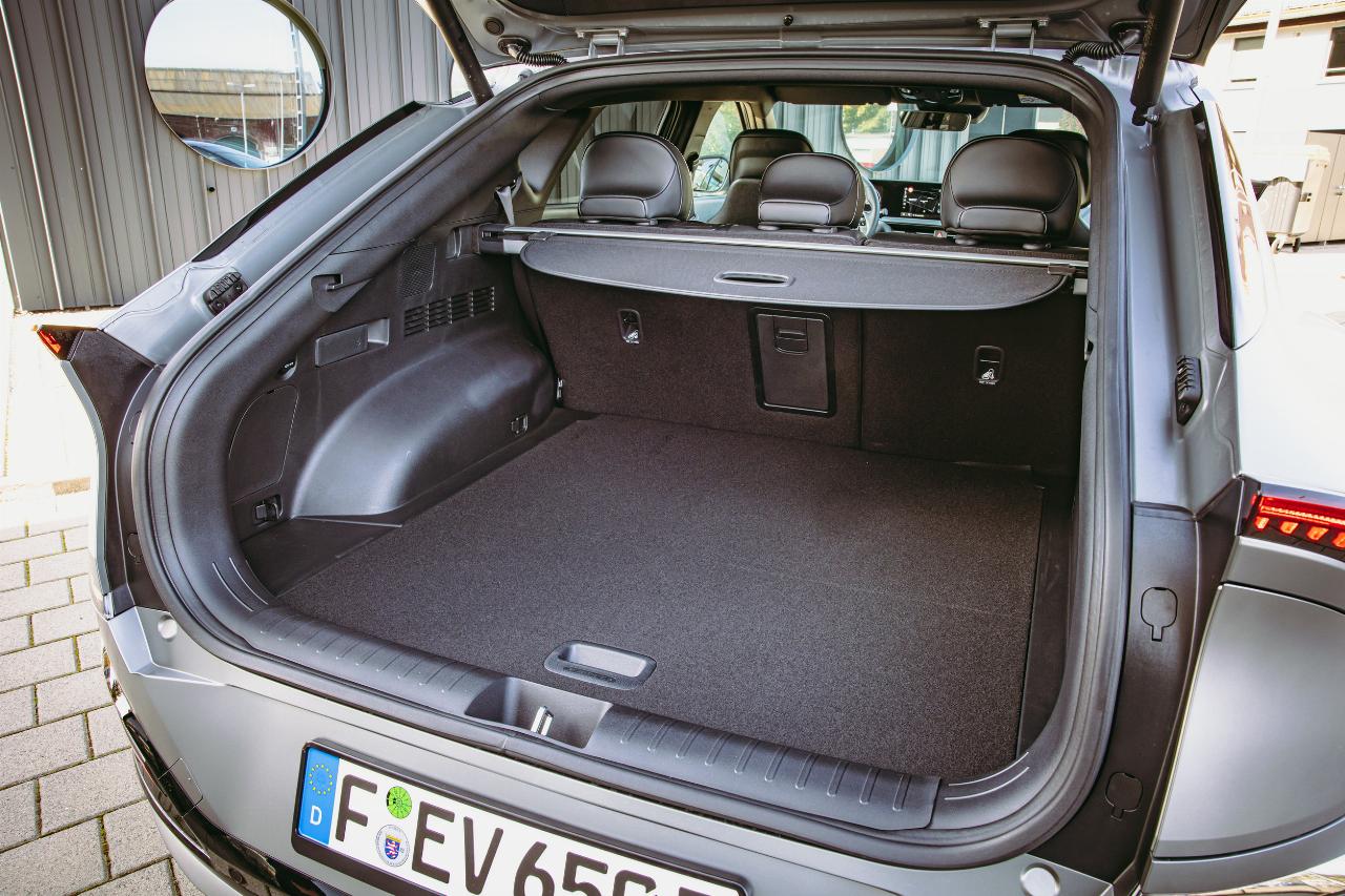 Außerdem bietet der Koreaner viel Platz für die Passagiere und rund um die scheinbar freischwebende Mittelkonsole hat der Koreaner reichlich Ablagemöglichkeiten. Der Kofferraum bietet 490 Liter Stauraum fürs Gepäck und fällt aufgrund der im Fahrzeugboden positionierten Akkus recht flach aus, ist aber durch Umlegen der Rücksitzlehnen auf 1300 Liter erweiterbar. Die geringe Zuladung von nur 440 Kilo ist für einen vollwertigen Fünfsitzer allerdings etwas zu wenig. Ein weiteres kleines Staufach befindet sich unter der vorderen Motorhaube. In dem kleinen „Frunk“, der bei unserem Allradler gute 20 Liter fasst, kann mühelos das Ladekabel oder Kleinkram verstaut werden. Bei der heckgetriebenen Variante des EV6 gibt es sogar mit 52 Litern etwas mehr Stauraum.