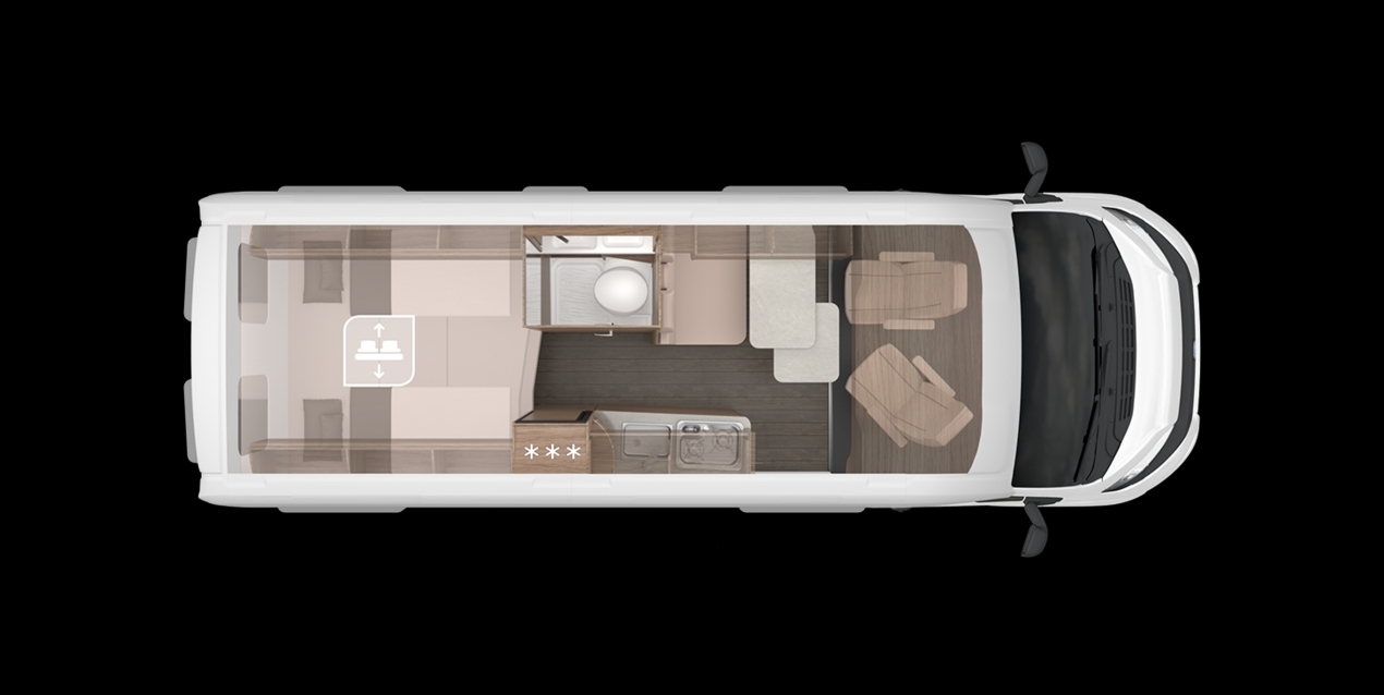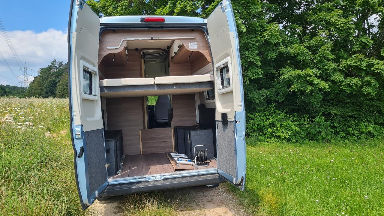 Ungewöhnlich ist das Angebot zweier weiterer Schlafplätze, die ein Hubbett über Dinette und Küche für rund 1300 Euro Aufpreis anbietet. Es ist 194 Zentimeter lang, aber nur 130 Zentimeter breit, dennoch wird der Boxlife zum Siebenschläfer, wenn gewünscht. Der Stauraum in Dach- und Kleiderschränken ist zwar üppig, wenn aber tatsächlich ein Septett auf die Reise geht, wird es arg eng an Bord. Die Vollauslastung empfiehlt sich wohl eher für sommerliche Wochenendausflüge, wenn der Camper in erster Line zum Übernachten und nicht zum Wohnen genutzt werden soll.
