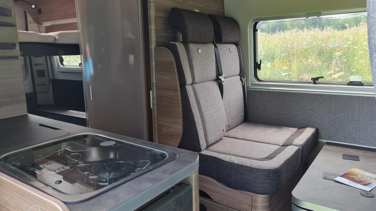 Vorn findet sich die übliche Einrichtung mit einer Halbdinette links, die zu einem Kinderbett umgebaut werden kann, rechts hingegen ist die Küche angeordnet, ihr Zwei-Flammen-Kocher wird von einer Drei-Kilogramm-Gasflasche gespeist, der 90-Liter-Kühlschrank wird mit elektrischer Energie betrieben; Heizung und Warmwasserbereitung arbeiten mit Dieselkraftstoff. Dies erlaubt den Verzicht auf große Gasflaschen, was wiederum dem Stauvolumen zu Gute kommt. Dafür bietet Knaus zusätzlich zur 95-Ah-Serienbatterie einen zweiten Akku für rund 600 Euro als Option an. Für Autarkie sorgt eine Photovoltaikelement auf dem Dach, das 100 Watt leistet und für 1100 Euro angeboten wird.