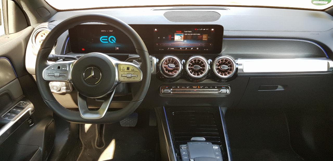 Der EQB ist zu Preisen ab 52.550 Euro (EQB 250) nicht billig, wenn auch nur unwesentlich teurer als sein technischer Zwillingsbruder EQA (ab 50.777 Euro). In der von uns gefahrenen Top-Version 350 4-Matic kostet er mindestens 58.197 Euro. Darin neben dem erwähnten Navi-System enthalten sind unter anderem LED-Scheinwerfer inklusive Fernlichtautomatik, Klimaautomatik, Spurhalte- und Bremsassistent, Rückfahrkamera, elektrische Heckkappe plus Laderaumpaket, Dachreling oder Ambientebeleuchtung. Was auffällt: alle Modellvarianten haben die identische Serienausstattung, also auch in der Topversion muss man für alles extra zahlen.