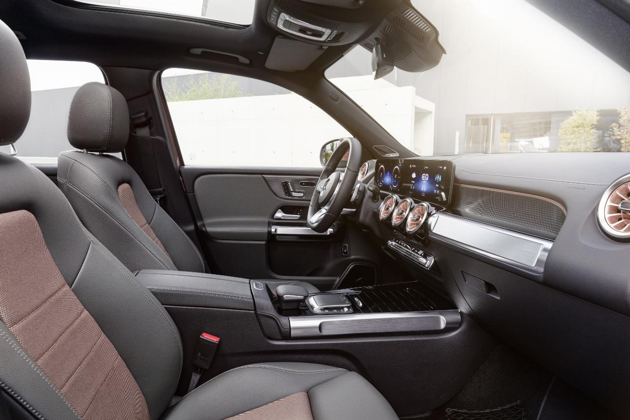 Auch das Interieur ist eins zu eins aus dem GLB übernommen, da es vom Cockpit-Layout mit bekanntem Multifunktionslenkrad über die MBUX-Bedieneinheit mit den beiden gleich großen 10,25-Zoll-Displays für Kombiinstrument und Infotainment oder der Armaturenanordung auf der Mittelkonsole inklusive Touchpad bis hin zu den turbinenähnlichen Lüftungsdüsen nahezu identisch ausfällt. Was einerseits eine hohe Verarbeitungsqualität bedeutet, andererseits aber auch bekannte Nickeligkeiten in Sachen Materialauswahl. Obwohl der Testwagen in der gehobenen Ausstattung mit allem Schnick und Schnack aufwartet, wirken einige Oberflächen im unteren Sichtbereich nicht wirklich wie „Das Beste oder nichts“, wie Mercedes vor nicht allzu langer Zeit noch als Maxime seines Schaffens vorgab.
