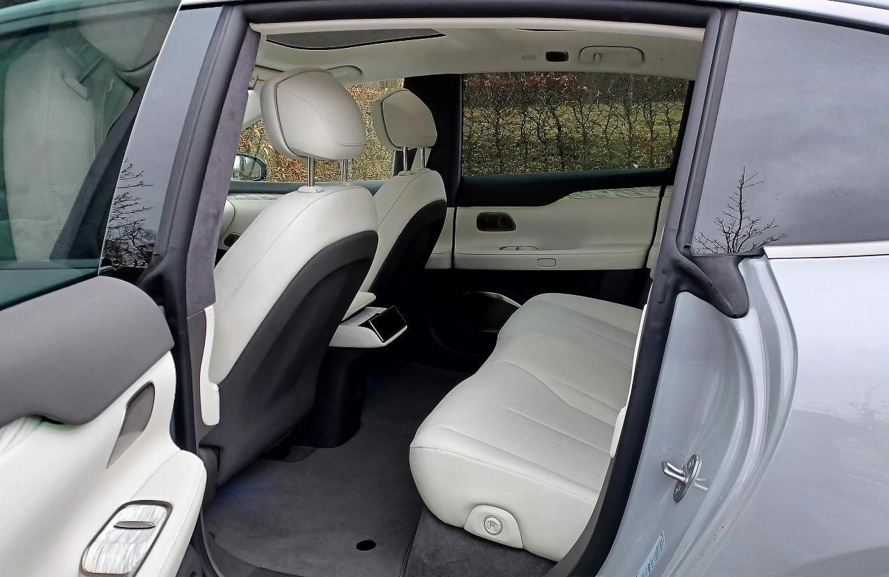In der Abgeschiedenheit einer großzügig dimensionierten Wellness-Lounge mit handschmeichelndem Rattan-Furnier und lederähnlichem PET-Rezyklat gleiten die Insassen vom Straßenlärm befreit dahin. Bei 100 km/h liegt das Geräuschniveau in der Kabine unter 60 Dezibel. Die Beinfreiheit im Fond ist dank drei Metern Radstand nicht anders als riesig zu nennen. Ist der Fahrersitz auf einen 1,90 Meter großen Menschen eingestellt, bleiben 35 Zentimeter Platz zwischen Lehne und hinterem Sitzpolster. Vorn beträgt die Kabinenbreite 1,52 Meter, hinten 1,49 Meter. Zwar ist die Ladekante nur 66 Zentimeter hoch, jedoch das Gepäckfach mit 363 Litern eher knapp bemessen. Vergleichbare Limousinen mit herkömmlichem Antrieb haben um die 500 Liter.