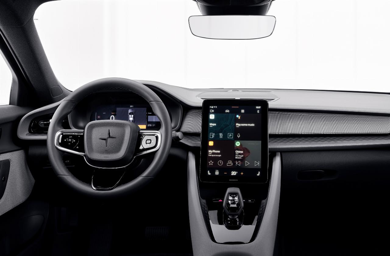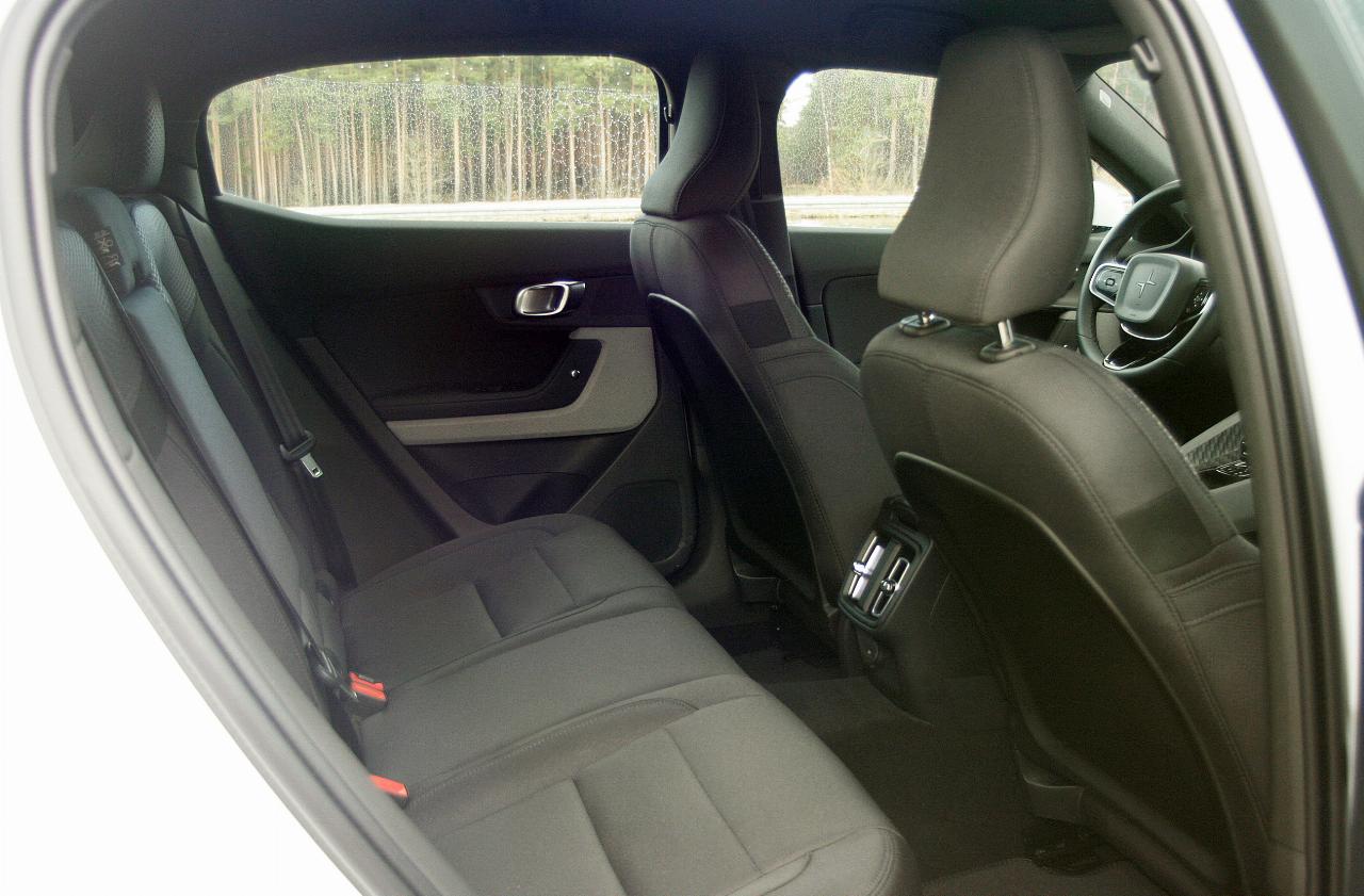 Auch an anderer Stelle fehlt es an Größe: Die Heckscheibe, die fast die Neigung eines Coupés hat, ist so klein, dass sie nur wenig Sicht auf den nachfolgenden Verkehr zulässt. Da trifft es sich gut, dass ab Werk gleich eine Rückfahrkamera mitgeliefert wird. Der Kabine kann man ausreichende Maße bescheinigen. Vorn haben die Passagiere 1,41 Meter zwischen den Türen Platz, hinten sind es immerhin noch 1,35 Meter. Die hinteren Seitenfenster sind nur zu zwei Drittel versenkbar. Das Gepäckvolumen hinter der stattliche 82 Zentimeter hohen Ladekante gibt Polestar mit 405 bis 1095 Litern an, der ADAC kam mit seiner Mess-Methode nur auf 340 bis 715 Liter. Die Ladekabel kosten keinen Stauraum, denn sie haben ihr Fach unter der Fronthaube. Textilbezüge an vielen Verkleidungsteilen untermauern den herausgehobenen Charakter des Fahrzeugs, nur die Gutschlösser sind wegen der breiten Mittelkonsole schlecht zugänglich.