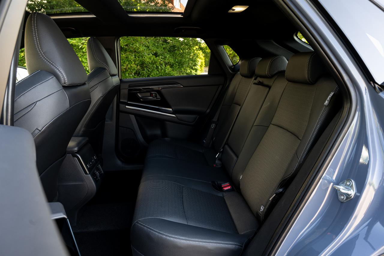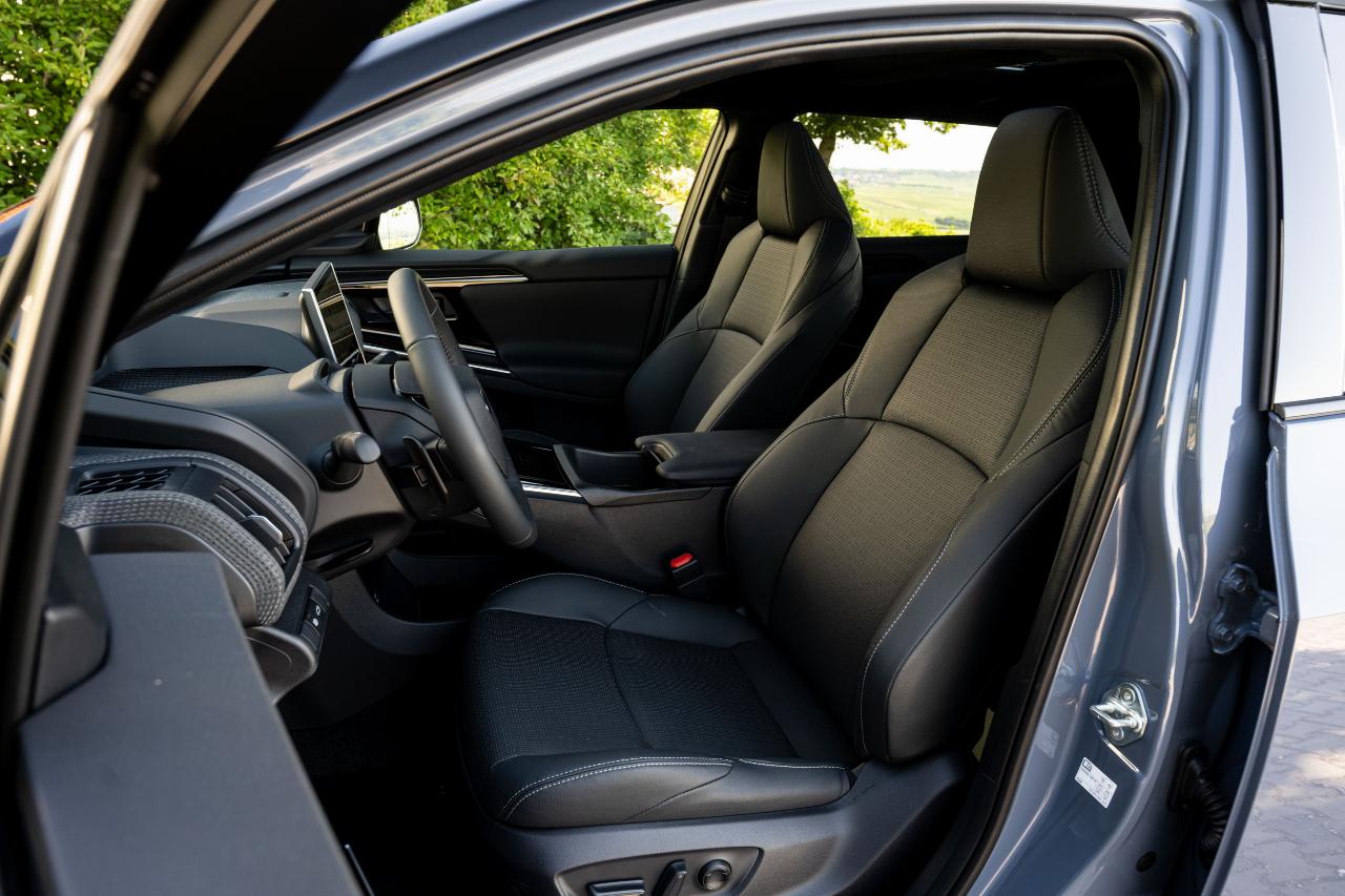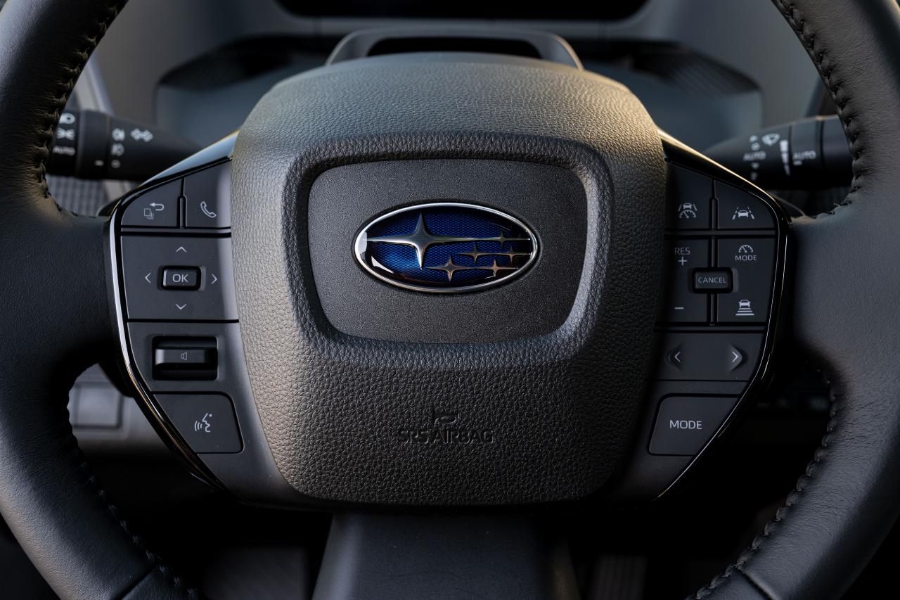 Das Armaturenbrett ist modisch stoffbespannt. Leider setzt Subaru das nicht bis in die Türen fort. So bleibt es bei viel Plastik und dem obligatorischen Klavierlack an vielen Stellen. Heraus sticht das weit nach vorn gesetzte Display mit zwei langen Streben. Es erinnert ein wenig an ein Flugzeugcockpit. Das trifft nicht jedermanns Geschmack, aber uns gefällt’s. Beim Toyota bZ4X bzw. Lexus RZ 450 wird dann übrigens in Verbindung mit dem optional erhältlichen, oben gekappten Lenkrad ein Schuh draus. Im Subaru muss dafür in Kauf genommen werden, das der obere Lenkradkranz auch schon einmal die eine oder andere Anzeigeinformation leicht verdeckt.