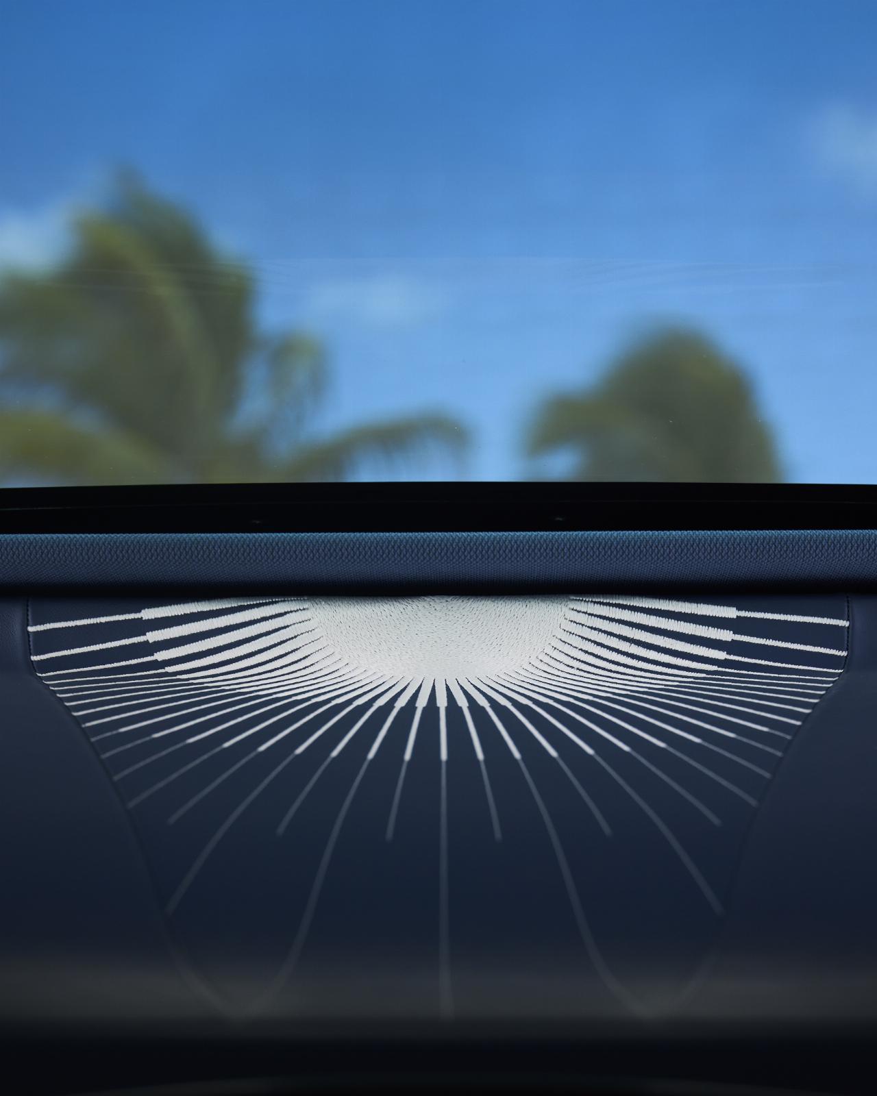 Dazu gesellen sich dunkle Naturholzfurniere und weiße Keramikoberflächen auf dem Schalthebel und den Bedienelementen. Der Fond bietet für zwei Passagiere 24‑fach verstellbare Massage-Sitze, ein Kühlfach für Getränke sowie einen elektrisch ausfahrbaren Clubtisch in der durchgehenden Mittelkonsole. Abgerundet wird der luxuriöse Innenraum durch zwei ausklappbare Sitze im Heck, die sogenannte „Tailgate Event Suite“, ebenfalls in Liberty Blue Near‑Analine‑Leder mit bestickten Sitzpolstern. (aum)