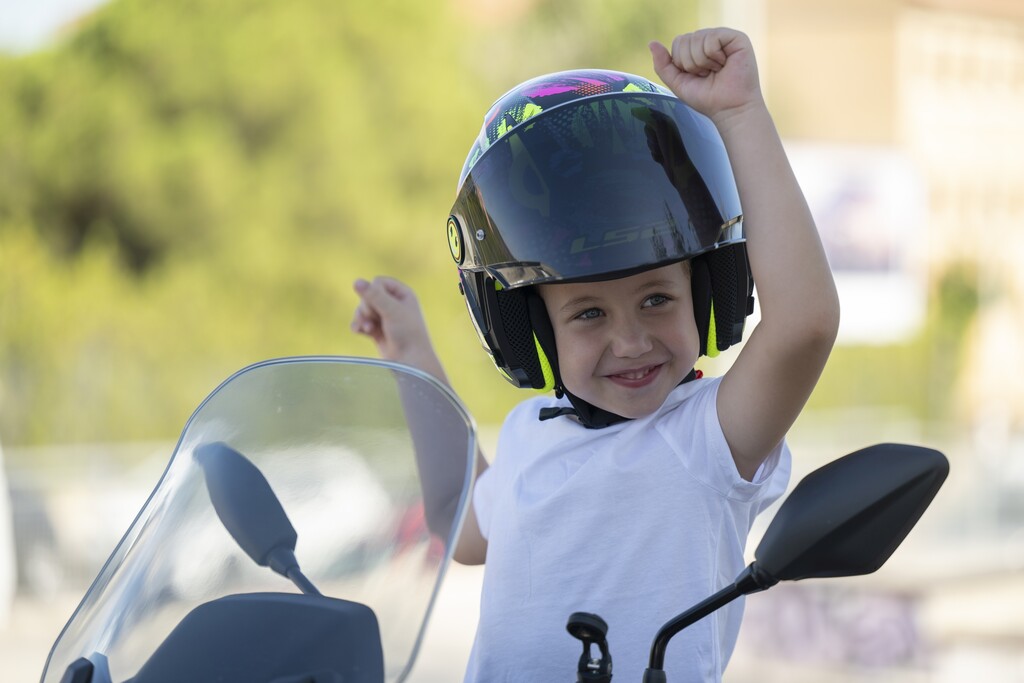 Selbstverständlich gilt die Helmpflicht auch für Kinder. Und ebenso die Vorgabe, dass der Schutz zur Kopfgröße passt und sämtlichen Sicherheitsvorschriften und Normen entspricht. Die GTÜ empfiehlt Erwachsenen und erst recht Kindern eindringlich, ausschließlich mit geeigneter und passender Schutzkleidung Motorrad zu fahren – spezielle Jacken, Hosen, Schuhe und Handschuhe, jeweils ausgestattet mit Protektoren. Dafür spricht allein die Vernunft. Außerdem kann Eltern im Falle eines Unfalls Fahrlässigkeit vorgeworfen werden, wenn Kinder nicht ausreichend geschützt worden sind.