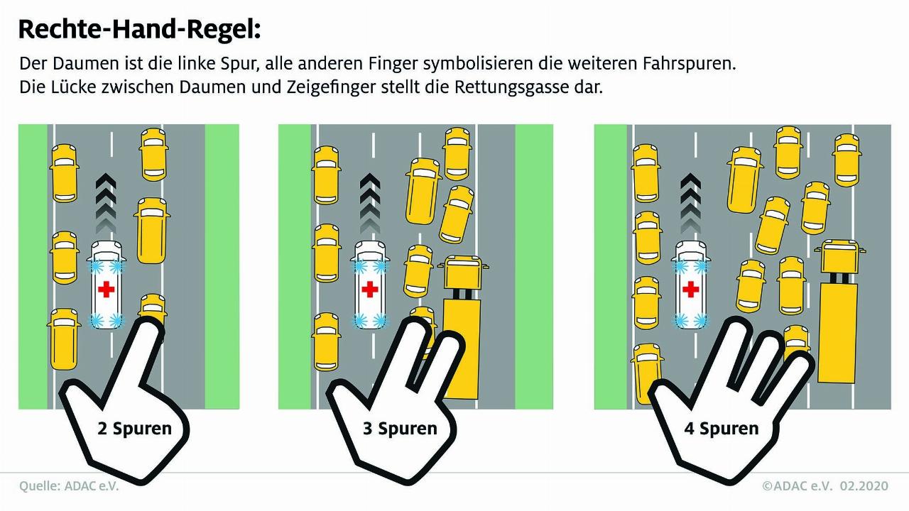 Doch wie sieht eine korrekte Rettungsgasse aus? Eine im Wortsinne simple Daumenregel empfiehlt die Gesellschaft für Technische Überwachung (GTÜ): Einfach von oben auf die rechte Hand mit gespreizten Fingern schauen – dann zeigen der Daumen nach links und die Finger nach rechts. Nach diesem Muster wird auch die Rettungsgasse gebildet. Die Fahrzeuge auf der äußerst linken Spur fahren an den linken Rand der Fahrbahn, und alle Spuren rechts davon weichen nach rechts aus. Aber Vorsicht: Der Standstreifen muss frei bleiben. Die Kfz-Überwachungsorganisation bietet dazu seit 2020 eine weitere clevere Gedächtnisstütze: Die Rückseite der von den GTÜ-Partnern auf der Windschutzscheibe angebrachten grünen Umweltplakette zeigt eine Grafik, wie man sich im Stau richtig verhält.