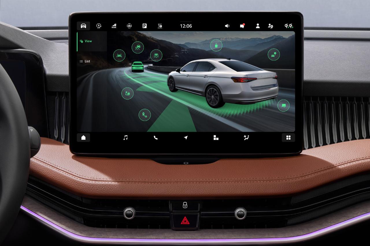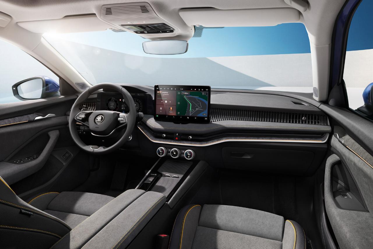 Zahlreiche Gadgets machen aus dem Superb das Schweizer Taschenmesser unter den Autos. Insgesamt zählt die Marke für den Superb 28 „Simply Clever“-Ideen auf. Alle Stoffe des Innenraums sind aus recyceltem Material. Die mögliche Lederausstattung wurde mit Abwässern der Olivenverarbeitung gegerbt. Das Zwei-Speichen-Lenkrad hat richtige Knöpfe und Drehregler. Auf der Mittelkonsole gibt es entgegen dem Trend zur Bedienung über den Bildschirm noch drei Drehregler.