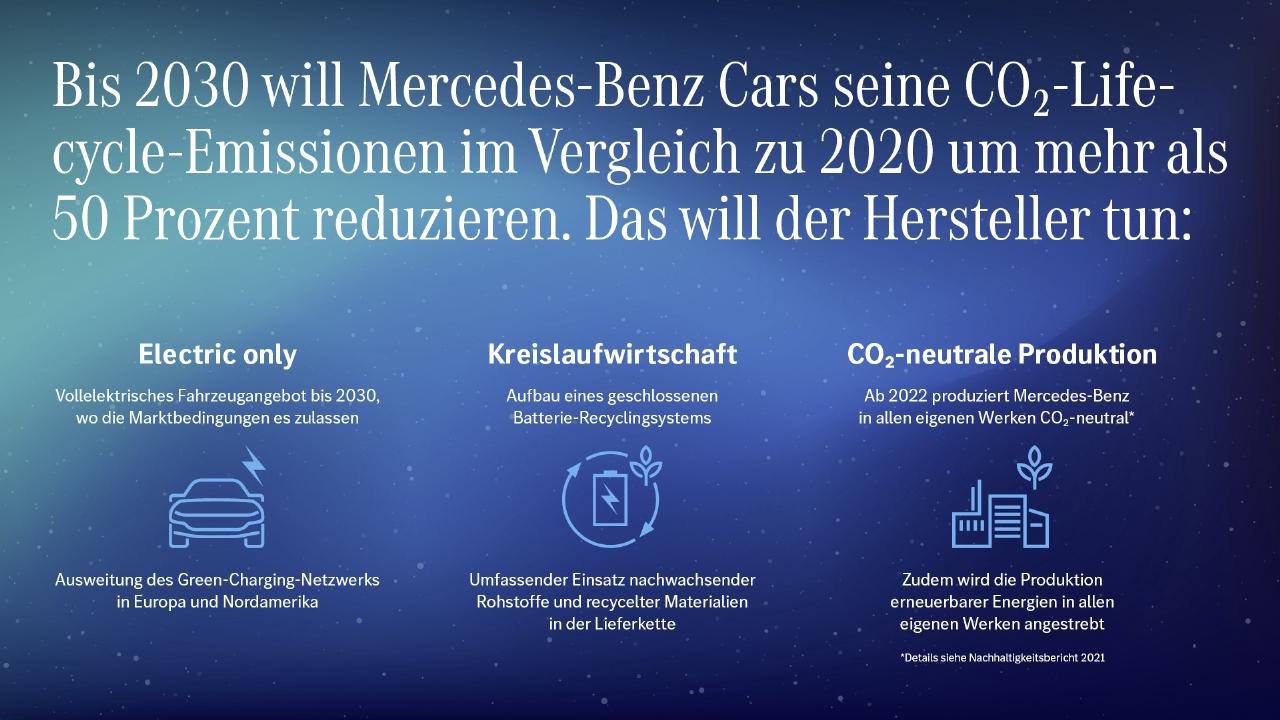 „Mercedes-Benz hat einen klaren Plan, klimaneutral zu werden“, sagte Kallenius. „Bis 2030 wollen wir die Hälfte des Weges erreichen. Um beim Klimaschutz schneller voranzukommen, brauchen wir maximales Engagement und mehr Zusammenarbeit zwischen Politik, Wirtschaft und der gesamten Gesellschaft". Die wichtigsten Hebel hierfür – so Källenius – seien die Elektrifizierung der Fahrzeugflotte, das Laden mit Grünstrom, die Verbesserung der Batterietechnologie sowie ein umfassender Einsatz von Recyclingmaterialien und erneuerbaren Energien in der Produktion.