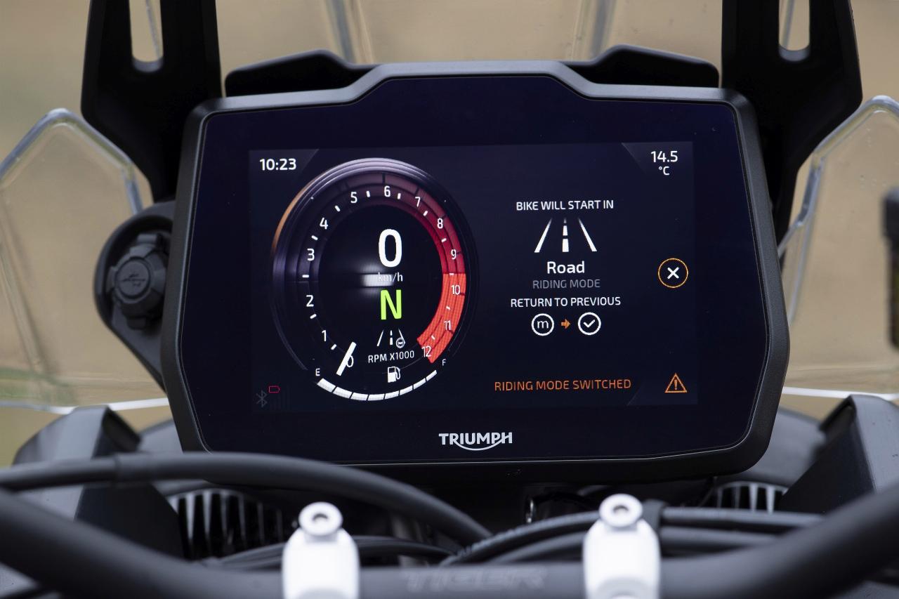 Das neue TFT-Display stammt von der großen Schwester Tiger 1200. Der Sieben-Zoll-Bildschirm ist beim Fahren an Schlichtheit und Übersichtlichkeit kaum zu toppen. Einen absolut perfekten Job macht auch der Schaltassistent, den Triumph den Pro-Modellen serienmäßig einpflanzt. Gangwechsel ohne Kupplung funktionieren damit ab circa 2000 Touren ganz famos; das bekommt längst nicht jeder Hersteller so geschmeidig hin.