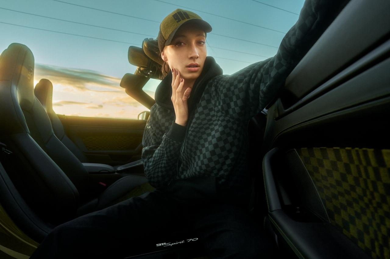 Eigens für den 911 Spirit 70 haben die Designer und Lackexperten von Porsche die Farbe Olive Neo kreiert – ein sattes, tiefes Grün. Einen spannenden Kontrast dazu bildet Bronzit. In diesem graugoldenen Farbton sind das Heckunterteil, das Bugteil und die Sport Classic Räder im „Fuchs“-Design lackiert. Das Verdeck ist schwarz, genauso wie der Windlaufrahmen. Drei schwarze Dekorstreifen auf der Fronthaube erinnern an die Sicherheitsbeklebung der Siebziger: Damals brachten Sportfahrer Längsstreifen auf den Karosserien ihrer schnellen Autos an, damit die Sportwagen bei hohen Geschwindigkeiten auf der Autobahn oder der Rennstrecke im Rückspiegel besser zu erkennen waren. Die Streifen werden auf dem Verdeck Ton-in-Ton fortgesetzt. An die sportliche Tradition der Marke knüpft die seitliche Dekorgrafik mit Porsche-Schriftzug und rundem Startnummernfeld („Lollipop“) sowie individueller Startnummer an.
