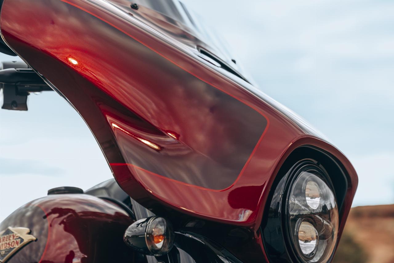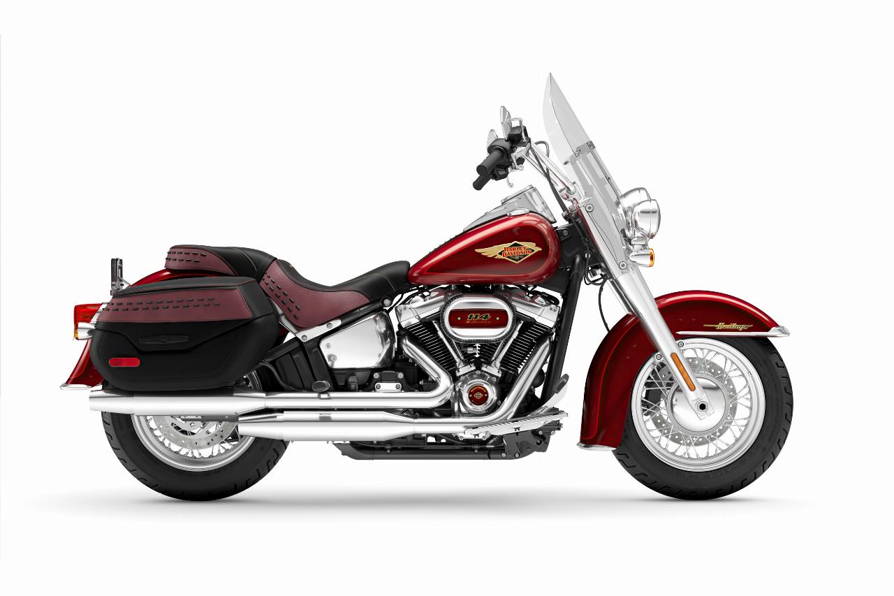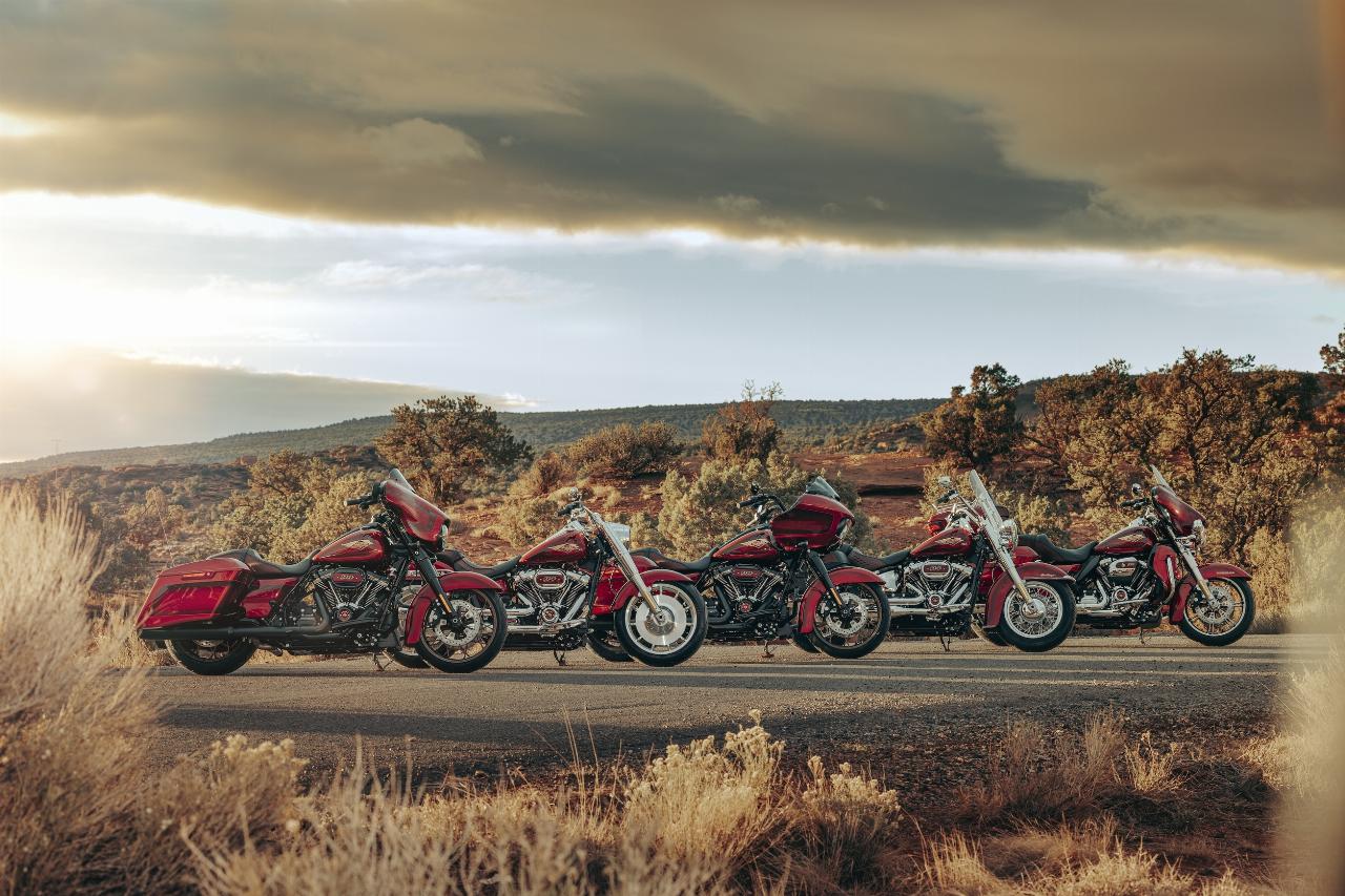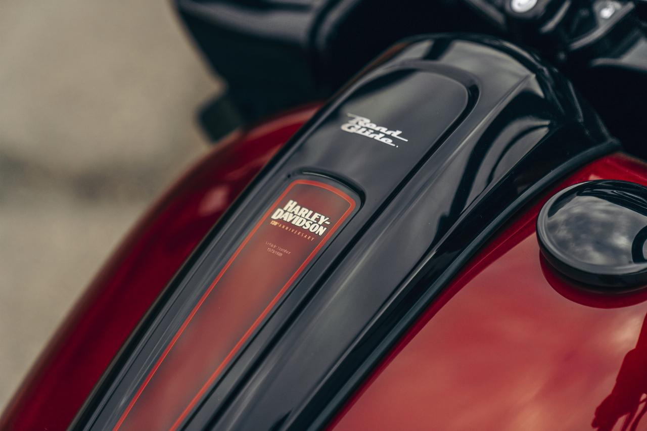 In ähnlichem Geburtstagsdress präsentieren sich die Anniversary-Ausgaben von Ultra Limited, Tri Glide Ultra, Street Glide, Road Glide, Fat Boy und Heritage Classic. Je nach Modell handelt es sich um Auflagen von 1100 bis 3000 Einheiten. Bei allen ist die Sonderlackierung von frühen Harley-Davidson-Motorrädern inspiriert. Hier bildet klassisches, glänzendes Heirloom Red bildet Basislack, der durch einen in Midnight Crimson gehaltenen Schattierungseffekt ergänzt und mit hellroten Pinstripes verziert ist. Das Markenlogo am Tank präsentiert ebenfalls einen Adler im Art-déco-Stil, die Sitze sind an den Flanken rot gefärbt und mit einem gestickten goldfarbenen Harley-Logo versehen, während der Antriebsstrang Inserts in Red Fade trägt. (aum)