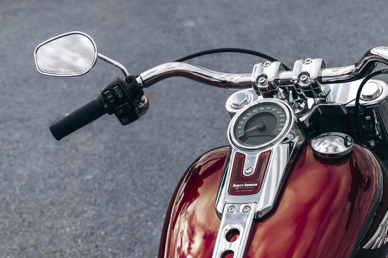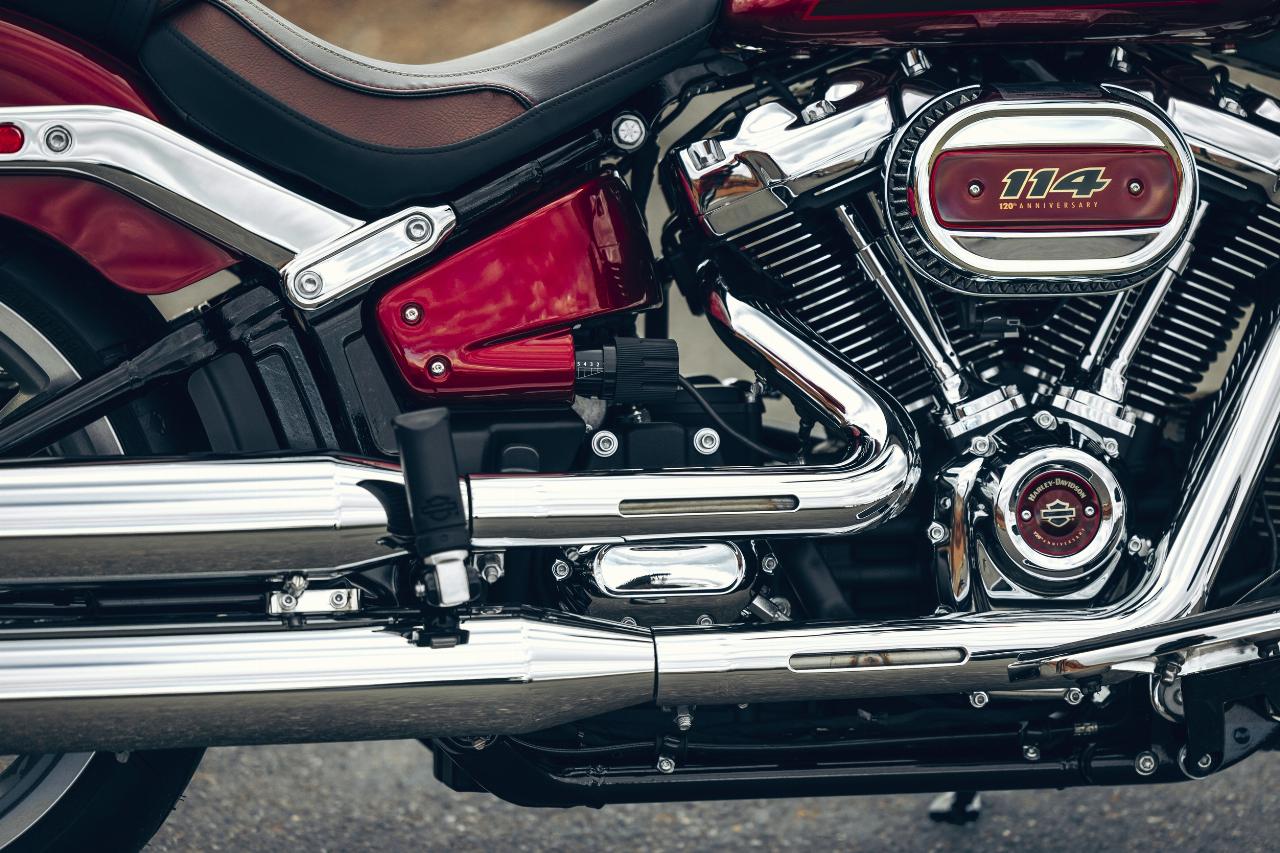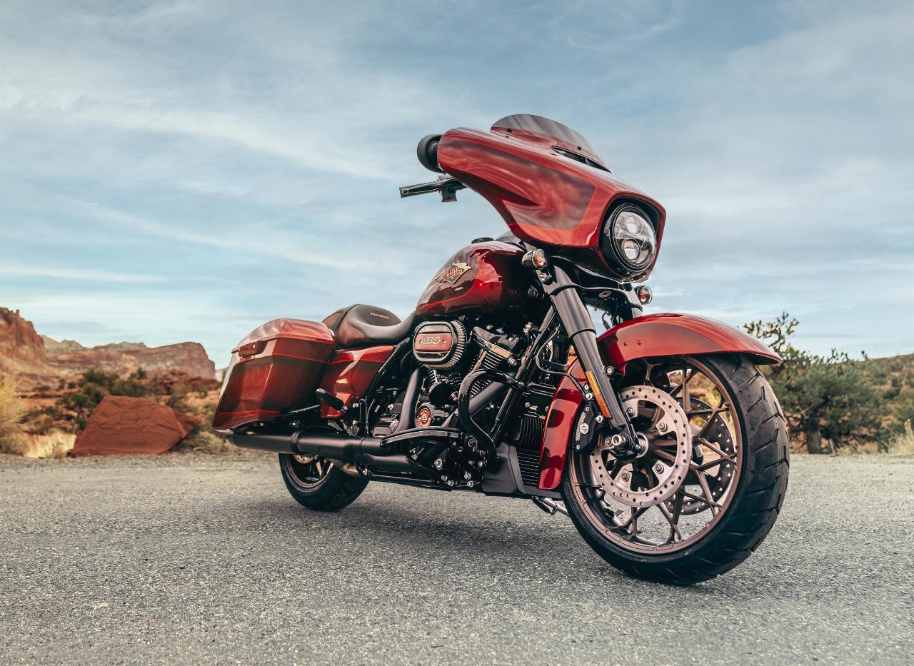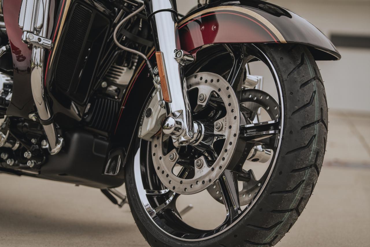 In ähnlichem Geburtstagsdress präsentieren sich die Anniversary-Ausgaben von Ultra Limited, Tri Glide Ultra, Street Glide, Road Glide, Fat Boy und Heritage Classic. Je nach Modell handelt es sich um Auflagen von 1100 bis 3000 Einheiten. Bei allen ist die Sonderlackierung von frühen Harley-Davidson-Motorrädern inspiriert. Hier bildet klassisches, glänzendes Heirloom Red bildet Basislack, der durch einen in Midnight Crimson gehaltenen Schattierungseffekt ergänzt und mit hellroten Pinstripes verziert ist. Das Markenlogo am Tank präsentiert ebenfalls einen Adler im Art-déco-Stil, die Sitze sind an den Flanken rot gefärbt und mit einem gestickten goldfarbenen Harley-Logo versehen, während der Antriebsstrang Inserts in Red Fade trägt. (aum)