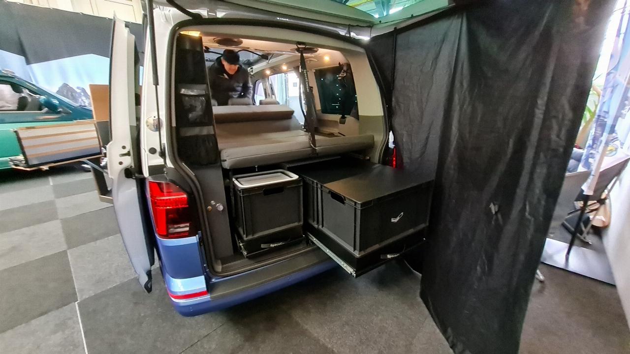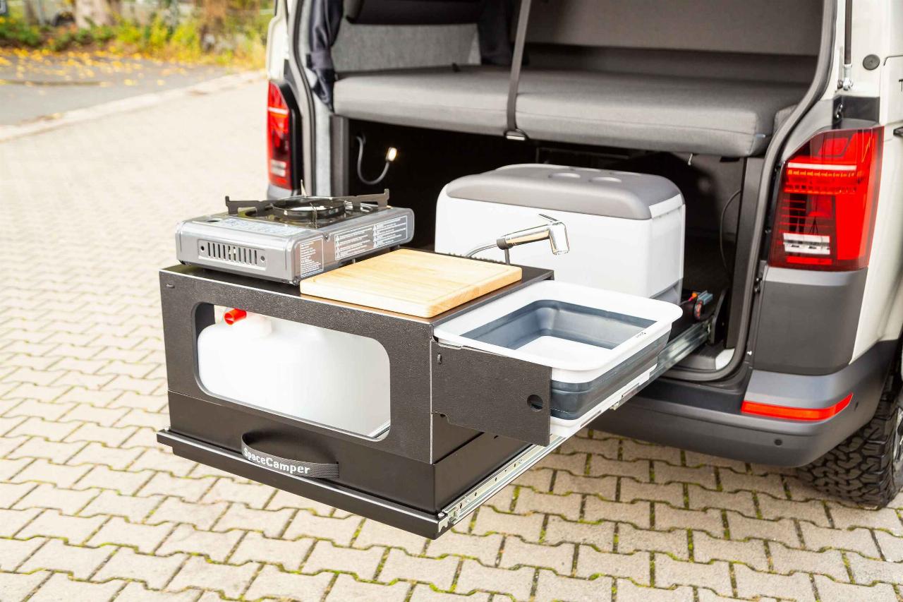 In der Tat lässt sich die patentierte Konstruktion – Kernstück eines jeden Space Camper – in Sekundenschnelle umklappen. Schlafsack drauf, fertig ist das Bett mit den Maßen 2,05 mal 1,65 Meter. Vor allem mit seiner Breite findet die Liegefläche Gefallen. Da die Küche anderenorts eingebaut wird, bietet das Space-Camper-Bett 25 Zentimeter mehr als der Klassiker California von Volkswagen Nutzfahrzeuge. Der Tisch davor ist nicht nur Tisch. Über einen Öldruckdämpfer wird er in Position gebracht und arretiert, auf Wunsch findet sich unter zwei Abdeckplatten in seiner Mitte eine Kochstelle mit zwei Gasflammen und eine Minispüle. Freiluftkochen geht auch, entweder mit einem schwenkbaren Küchenmodul, das im Modell Limited Open durch die serienmäßige zweite Schiebetür auf der Fahrerseite ins Freie gleitet. Alternativ gibt es eine komplette Küche mit Wasserversorgung, Kocher und Kühlbox auch als Auszug im Heck, die geöffnete Heckklappe und ein maßgeschneidertes Zelt schützen vor Regen und Wind.