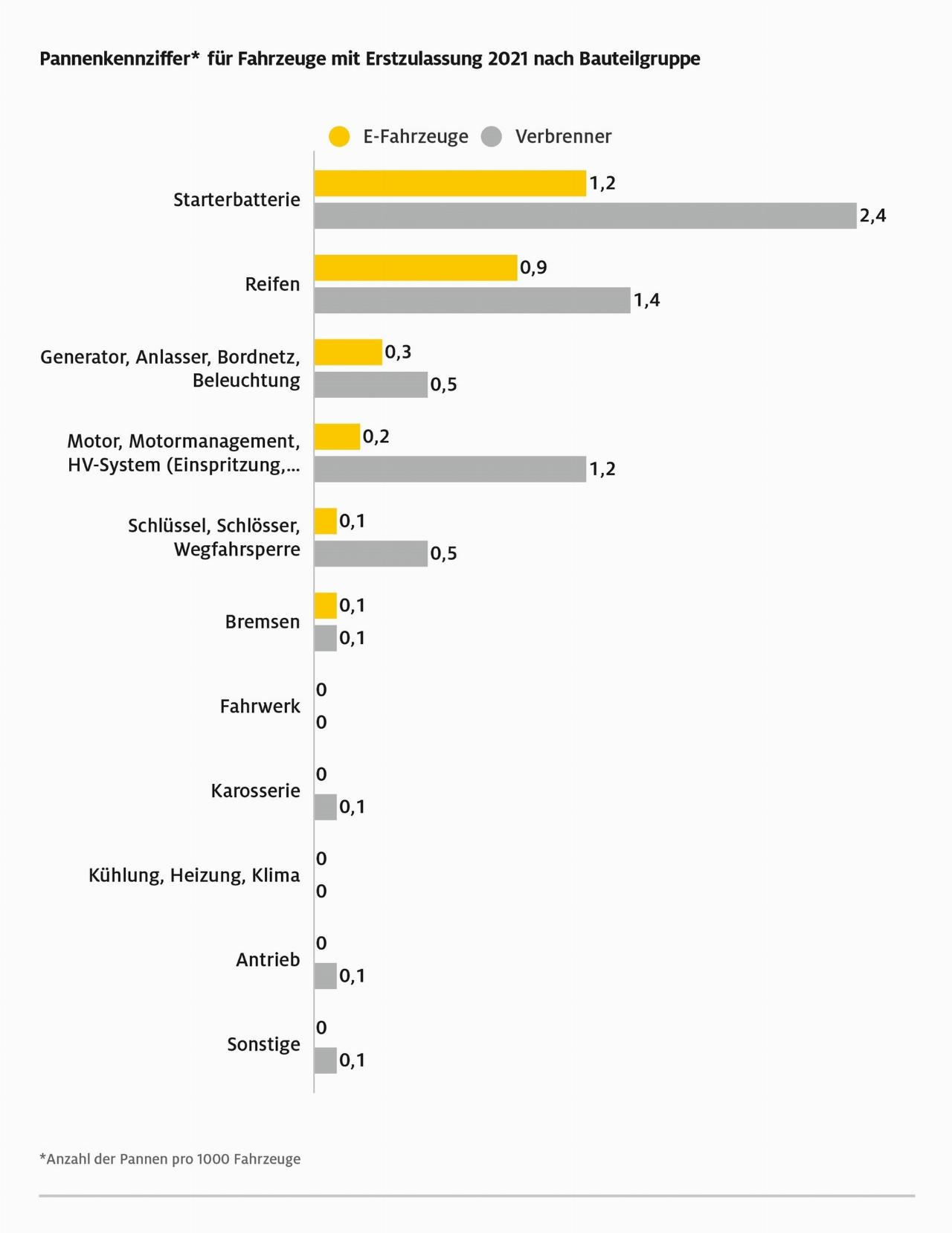 Der genauere Blick auf die 2021 neuzugelassenen Fahrzeuge zeigt, dass auch hier die Batterie Schwachstelle Nummer eins ist – bei Verbrennern und bei Elektroautos. Mit einer Pannenkennziffer von 2,4 Pannen pro 1000 zugelassenen Fahrzeugen liegen die klassisch angetriebenen Autos aber deutlich vor den elektrischen (1,2). Auch bei der für diesen Jahrgang zweithäufigsten Pannenursache – defekten Reifen – ist ein deutlicher Unterschied zwischen herkömmlichen Antrieben (1,4) und Elektrofahrzeugen (0,9) auszumachen. Dies dürfte zu einem großen Teil auf die geringere Fahrleistung der Elektrofahrzeuge zurückzuführen sein. Signifikante Unterschiede zeigen sich auch bei Problemen rund um den Motor: Während dieser Bereich bei den 2021er Autos mit konventionellem Antrieb für 1,2 Pannen pro 1000 Fahrzeuge verantwortlich ist, sind es bei elektrisch angetriebenen Modellen nur 0,2 Pannen. Kaum Unterschiede zwischen den Antriebsarten gibt es dagegen bei den Bauteilen Bremsen, Fahrwerk und Karosserie.