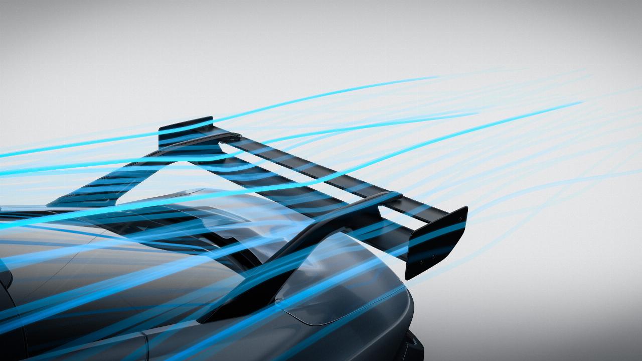 In schnellen Kurven hingegen kommt es auf aerodynamisch generierten Abtrieb an: Je stärker der Mustang GTD durch den Luftstrom auf die Fahrbahn gepresst wird, desto mehr Seitenführung kann das Auto aufbauen. In diesem Fall klappt das bewegliche Spoilerelement des Heckflügels nach unten und stellt sich damit steiler in den Wind. Zeitgleich öffnen sich die schmalen Flaps im seitlichen Frontbereich und lenken einen Teil der Unterboden-Luftströmung gezielt in die Radhäuser, wo sie durch die so genannten Louvres entweichen können. Diese Entlüftungslamellen im oberen und hinteren Kotflügelbereich erzeugen bei hohem Tempo einen Unterdruck, der die Vorderräder wie ein Sog stärker an die Straße saugt. Parallel dazu werden Luftturbulenzen durch die rotierenden Vorderräder von der Karosserie abgelenkt. Das steigert das Einlenk- und Kurvenverhalten. Für Fahrten auf der Rennstrecke kann das Fahrwerk vier Zentimeter tiefergelegt werden.