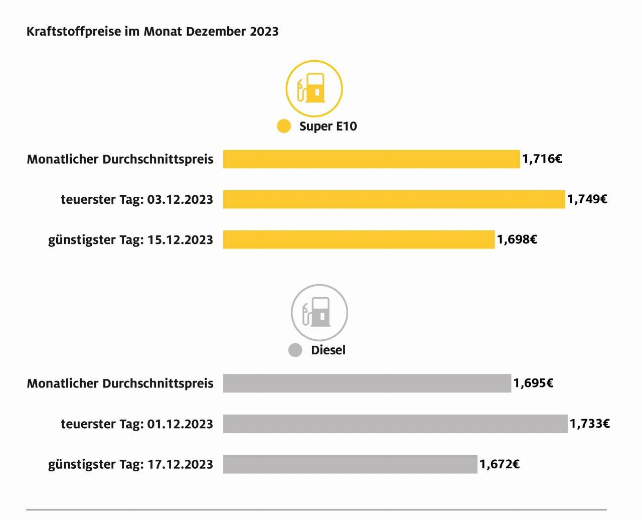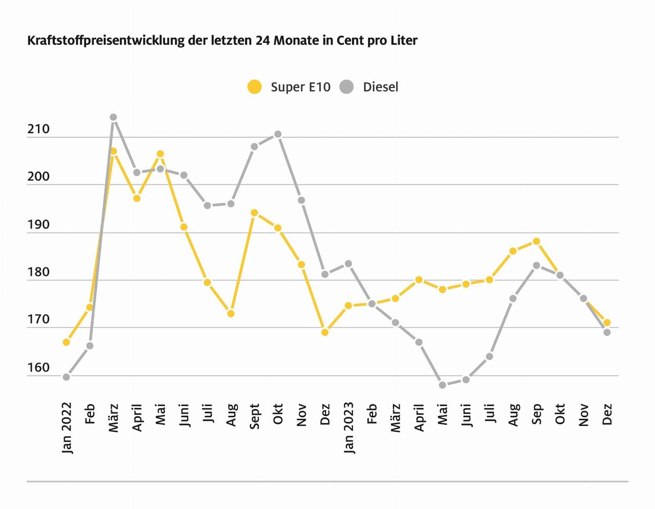 Damit ist Diesel auch im Jahresvergleich wieder günstiger als Super E10. Das sah 2022 noch anders aus, als Diesel erstmalig auch im Jahresschnitt teurer war, begünstigt durch verschiedene Faktoren wie den russischen Angriff auf die Ukraine, Lieferengpässe sowie industriell gestiegene Nachfrage. Auch 2023 setzten sich diese auch aus Verbrauchersicht negativen Effekte teilweise fort. Hinzu kam im Herbst ein neuer Krisenherd im Nahen Osten, der aber bisher nur kurzzeitig Auswirkungen auf den Ölpreis hatte.