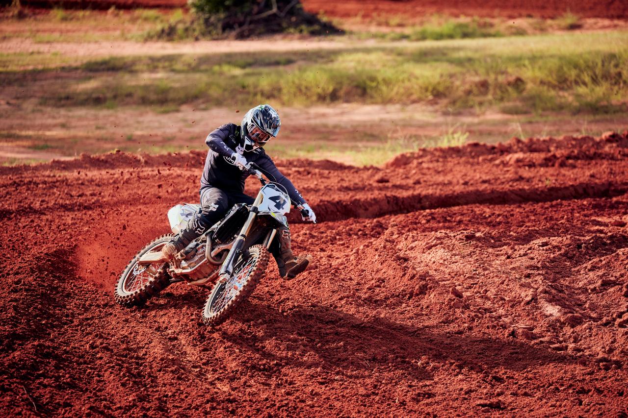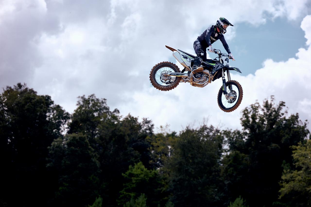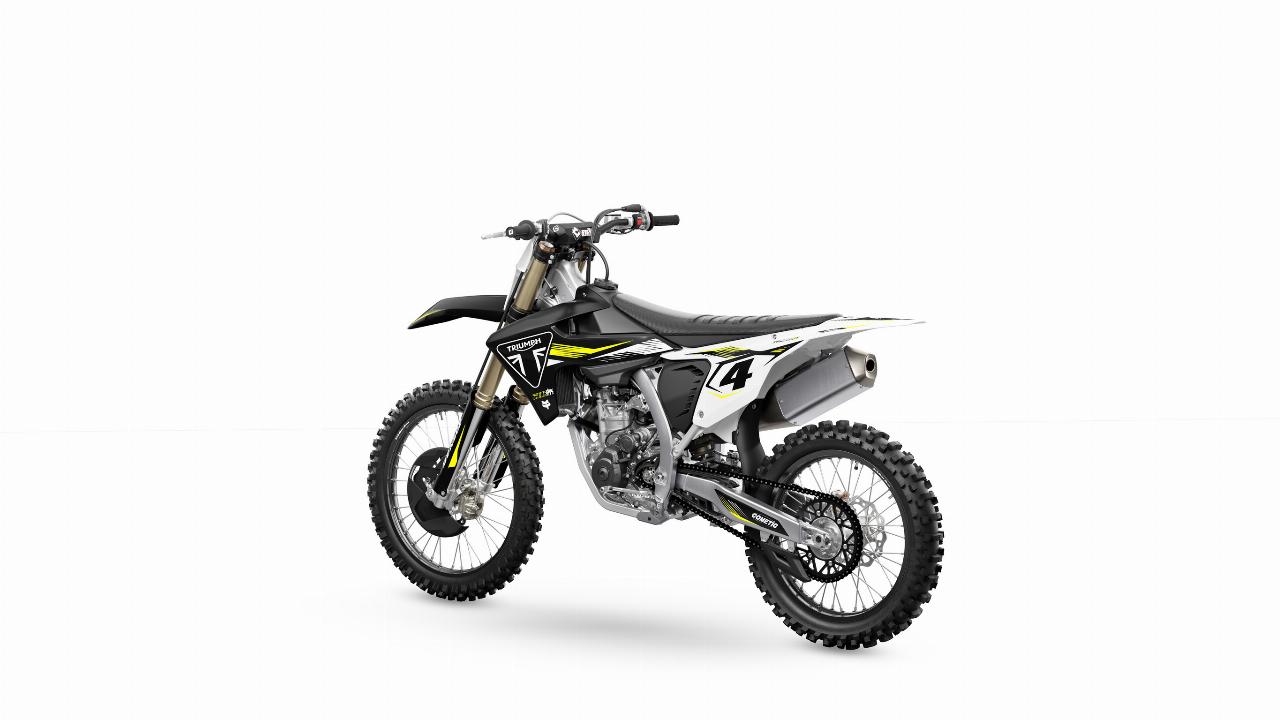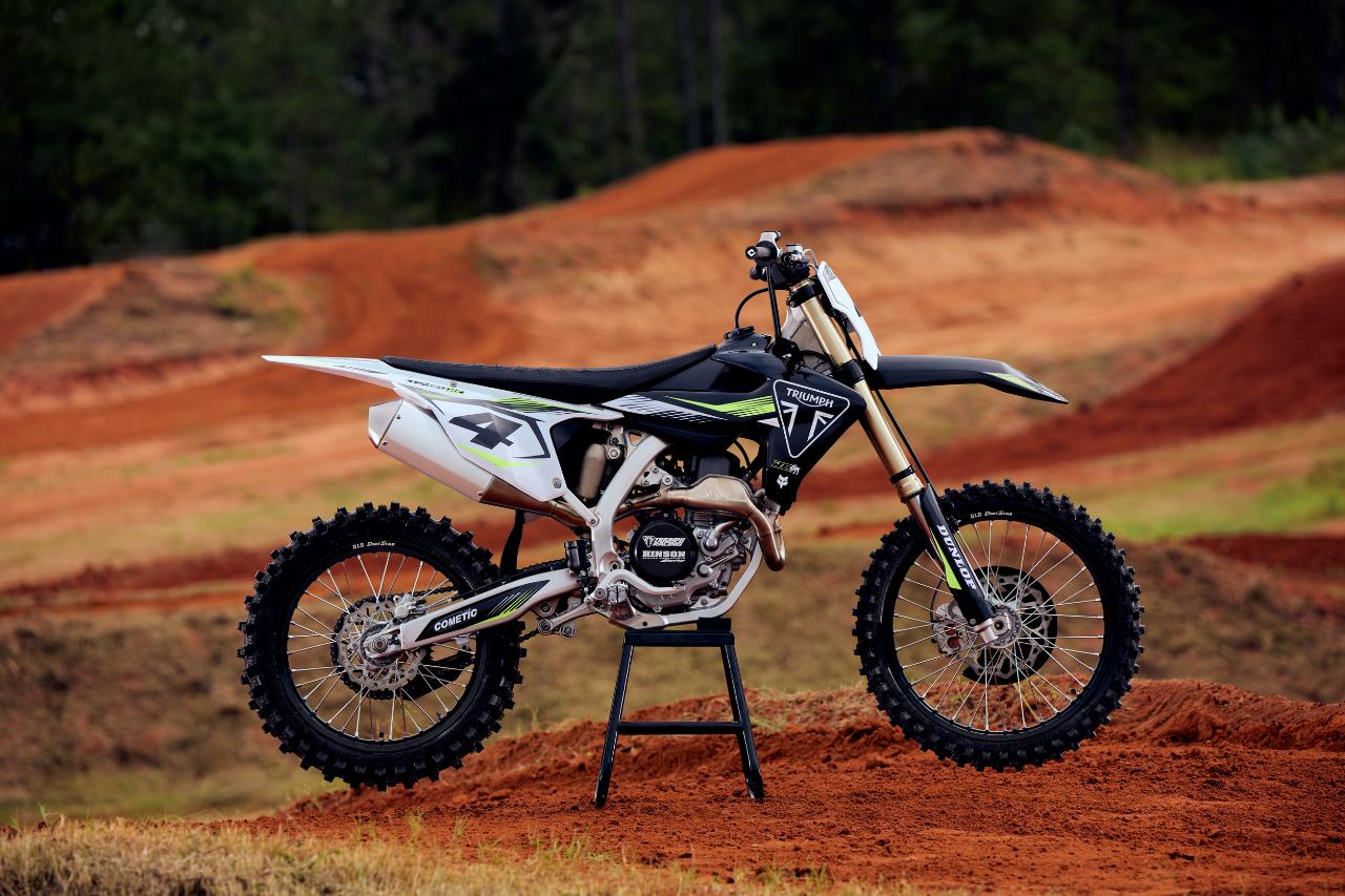 Nach der TF 250 greift Triumph mit der TF 450 planmäßig nun auch eine Klasse höher in den Motocrosssport ein. Ihr Debüt gibt die Maschine als „Ricky Carmichael Edition“. Der 15-fache US-Meister half bei der Entwicklung mit. Auch das Farbdesign und die Graphics orientieren sich an der MX-Legende. So trägt die TF 450-RC Edition seine Startnummer „4“, das „GOAT“-Logo (Greatest of all Times) und Details der Hauptsponsoren.
