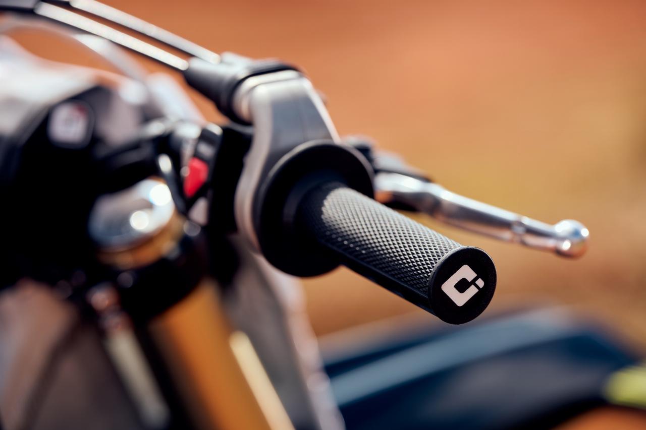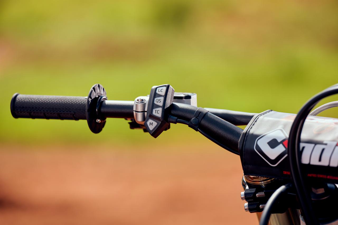 Das Fünf-Gang-Getriebe des 450-Kubik-Einzylinders besitzt serienmäßig einen Quickshifter für kupplungsloses Hochschalten vom zweiten in den letzten Gang. Es gibt eine Reihe von wählbaren Motorkennfeldern, von denen eines von Rick Carmichael selbst festgelegt wurde. Die Parameter für die Traktionskontrolle und die Launch Control können per App verändert werden.