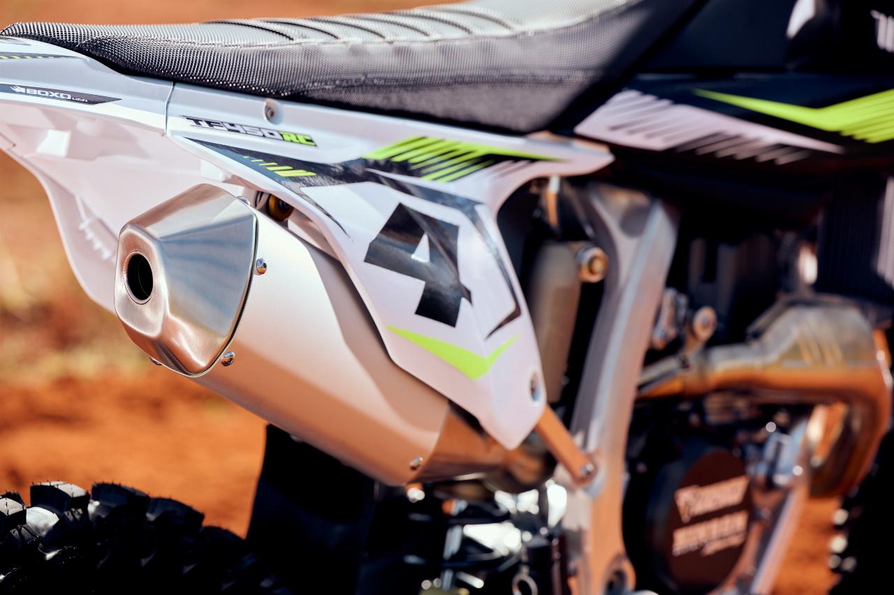 Das Aluminium-Chassis steht nach Angaben von Triumph für das beste Leistungsgewicht in der Klasse: Nass wiegt die TF 450 knapp 109 Kilogramm. Das Standardmodell verfügt über einen leichten Edelstahlauspuff. Als Zubehör ist ein Akrapovic-Titanauspuff erhältlich.