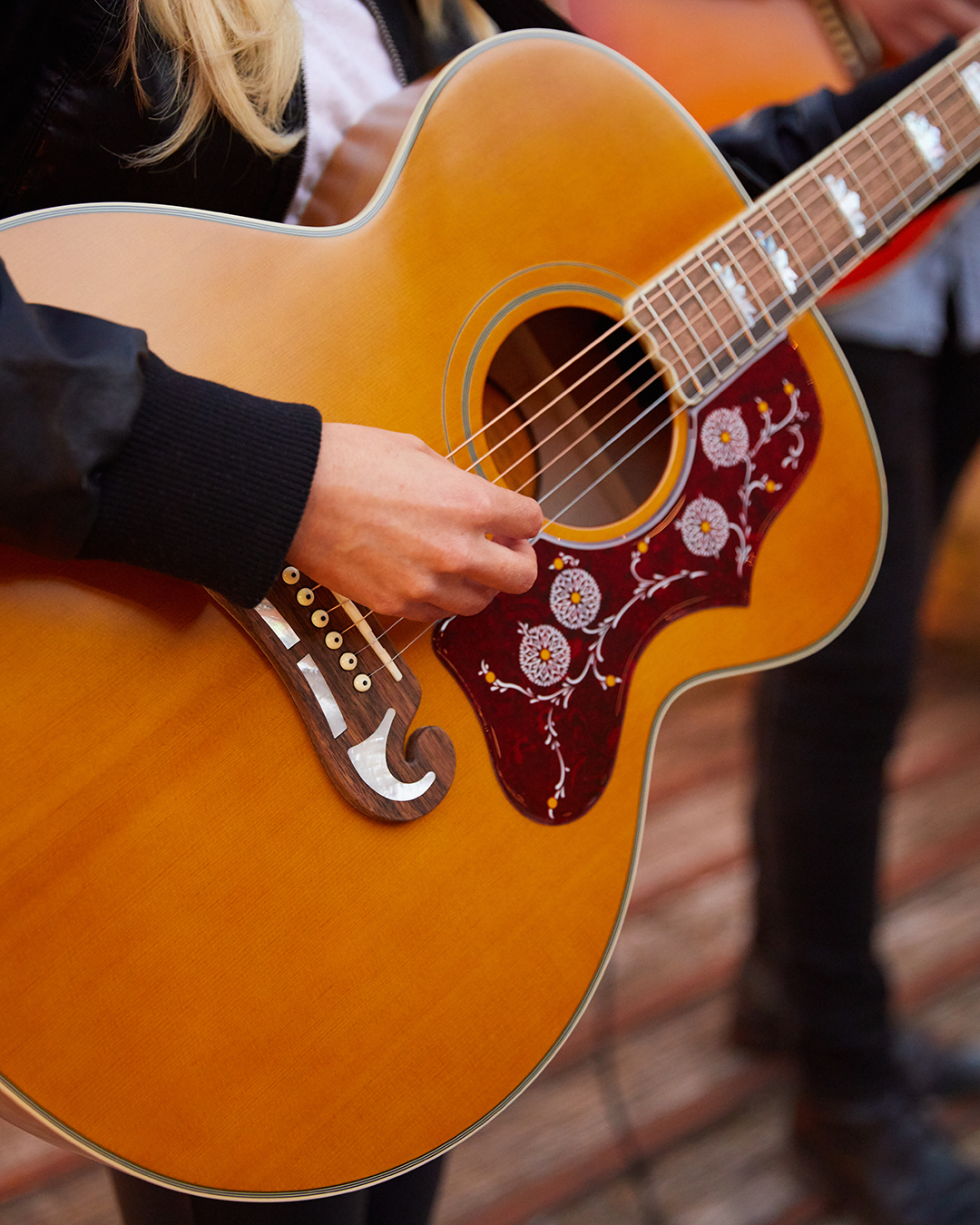 Bei den Gitarren handelt sich um eine Epiphone 1959 Les Paul Standard als detailgetreue Repikla. Sie trägt die Unterschrift von Billy Duffy, Mitglied der englischen Rockband „The Cult“. Die Epiphone J-200 ist eine Hommage an die Gibson SJ-200, zu der unter anderem Musiklegenden wie Emmylou Harris, Elvis, Jimmy Page, Bob Dylan, George Harrison und The Edge gegriffen haben. Signiert ist die Akustikgitarre vom amerikanischen Countrymusiker Big Kenny von „Big & Rich“. Die Epiphone SG Standard, die mit Bands wie „AC/DC“, „The Who“, „Cream“ und „Black Sabbbath“ verbunden ist, ist das dritte Stück. Unterschrieben ist die Gitarre vom kanadischen Singer-Songwriter Clayton Bellamy von „The Road Hammer“.