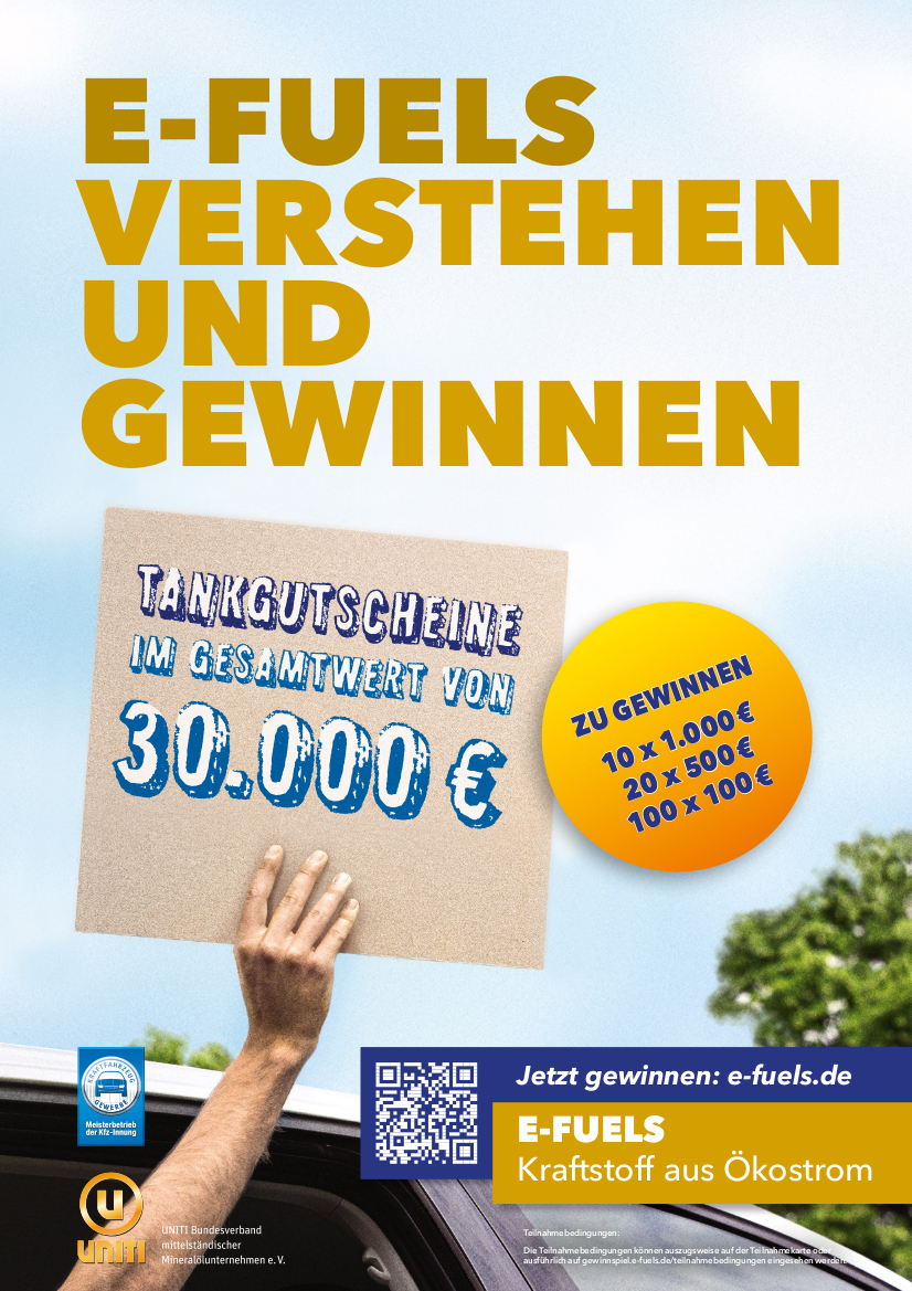 Die Kampagne läuft bis Ende April läuft. Wer fünf Fragen zu den synthetischen Kraftstoffen richtig beantwortet, kann einen Tankgutschein in Höhe von 100, 500 oder 1000 Euro gewinnen. Die Teilnahme ist über Karten, die in Tankstellen und Kfz-Werkstätten ausliegen, oder auf www.e-fuels.de möglich. (aum)