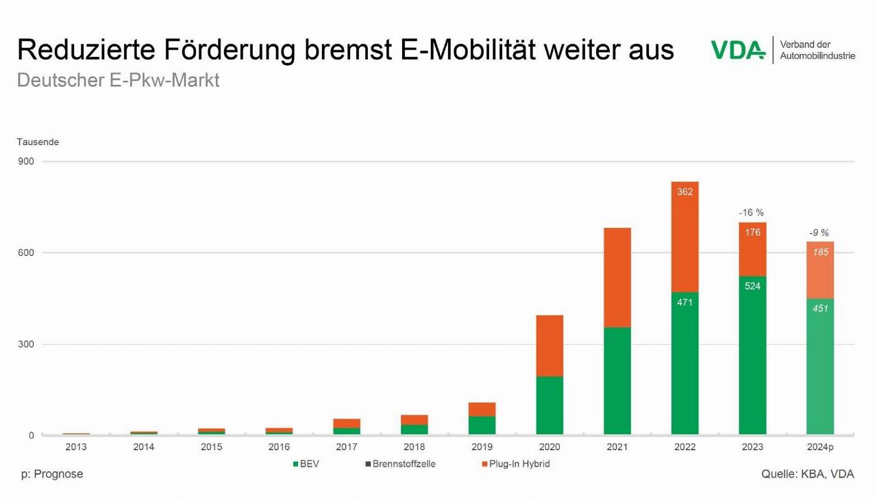 VDA-Chefvolkswirt Dr. Manuel Kallweit gab im Rahmen der Pressekonferenz die wichtigsten Prognosen des VDA für das Jahr 2024 bekannt. Der VDA rechnet für den deutschen Markt rechnen wir 2024 mit einem Rückgang von einem Prozent auf 2,8 Mio. Einheiten. Das ist etwa ein Viertel weniger als im Vorkrisenjahr 2019. Dabei gehen wir von einem niedrigeren Absatz von Elektro-Pkw aus (Minus neun Prozent auf 635.000 Einheiten). Während der Absatz von Plug-In-Hybriden (PHEV) um fünf Prozent auf 185.000 Einheiten steigen dürfte, geht der Verband bei den rein batterieelektrischen Fahrzeugen (BEV) von einem Rückgang von 14 Prozent auf 451.000 Einheiten aus.