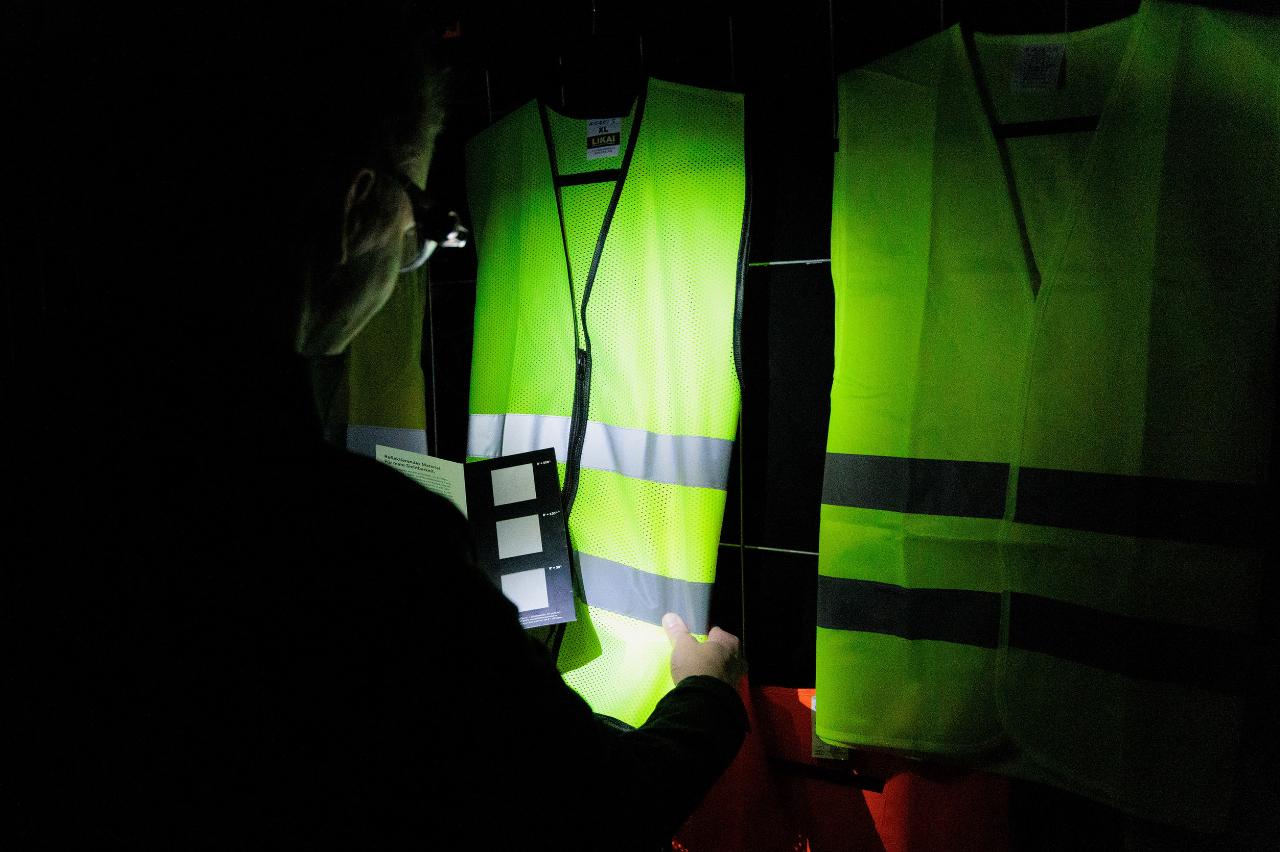 Für eine einfache Überprüfung zu Hause empfiehlt sich ein Lichttest mit einer Taschenlampe, die man direkt neben das Auge hält und aus etwa drei Metern Entfernung auf die Weste leuchtet. Gute Warnwesten reflektieren das Licht strahlend weiß – mangelhafte Modelle sind dagegen kaum heller als ein Blatt Papier.
