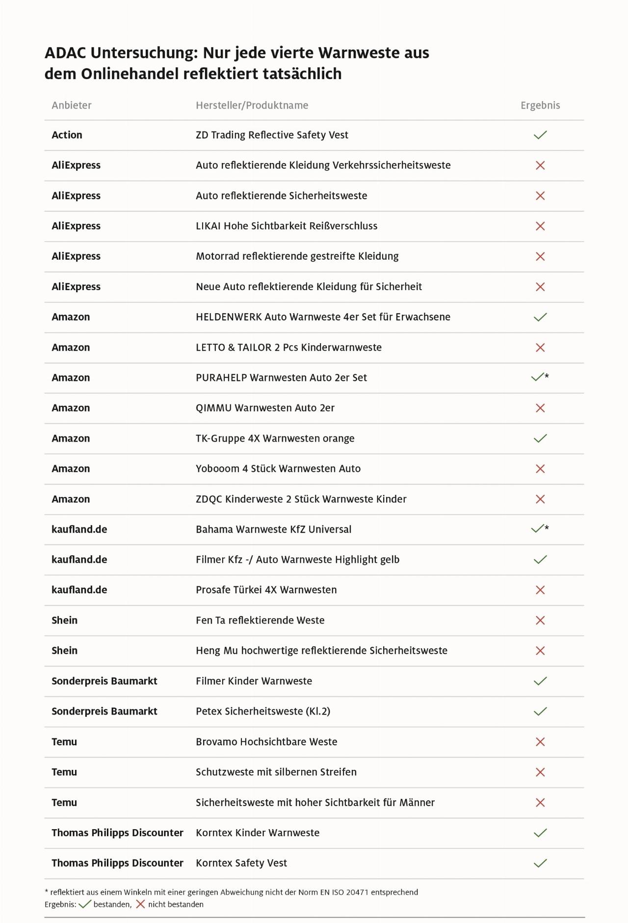 Vor allem Warnwesten von chinesischen Online-Plattformen wie Aliexpress, Shein oder Temu schnitten schlecht ab. Hier erfüllte keine der zehn geprüften Warnwesten die Norm. Aber auch bei Amazon fand der ADAC bei der Hälfte der Angebote nicht ausreichend reflektierende Warnwesten, die im Notfall nutzlos sind. Besonders bedenklich: Auch Kinderwarnwesten sind betroffen. Zwei Modelle, die bereits in der ADAC-Untersuchung im vergangenen Jahr durchgefallen waren, erfüllten die Normanforderungen wieder nicht. Teilweise war der aufgenähte Reflektorstreifen nicht mehr als ein graues Stück Kunststoff, das praktisch keine rückstrahlende Wirkung hatte. Mitunter war sogar ein Hinweis auf die geltende ISO-Norm für Warnwesten eingenäht, die diese Westen nicht im Ansatz erfüllen.